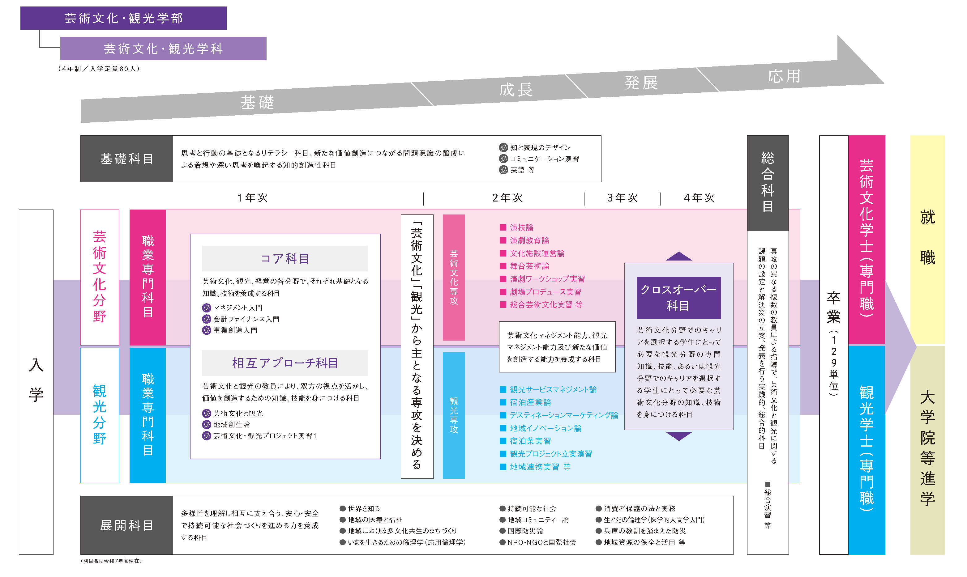 全ての学生が「芸術文化」と「観光」の異なる分野を共通して学びますが、その中でも専門性を高めるため、いずれかを「主となる専攻」、もう一方を「副となる専攻」として学びます。