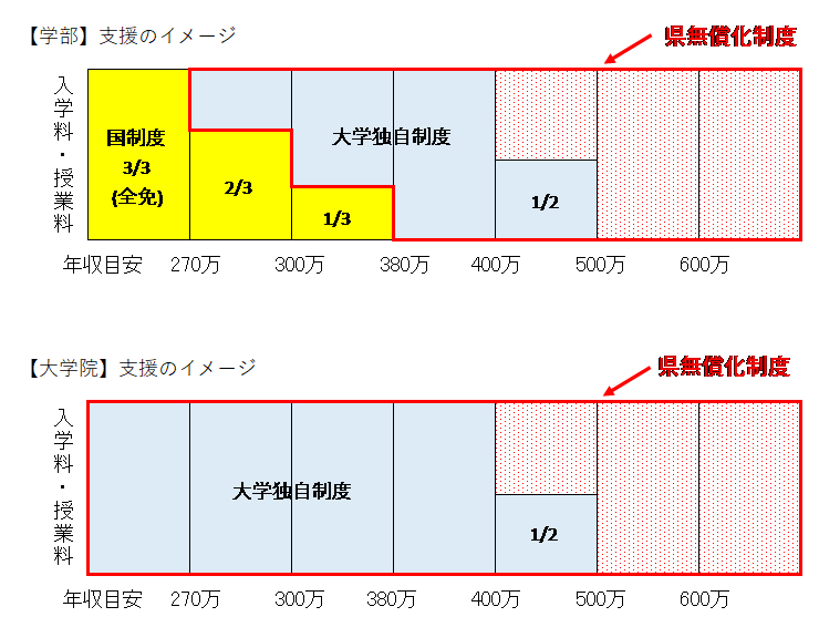国制度と併せて、入学料及び授業料負担を軽減するため、下記イメージ図のとおり授業料等の無償化を行います。