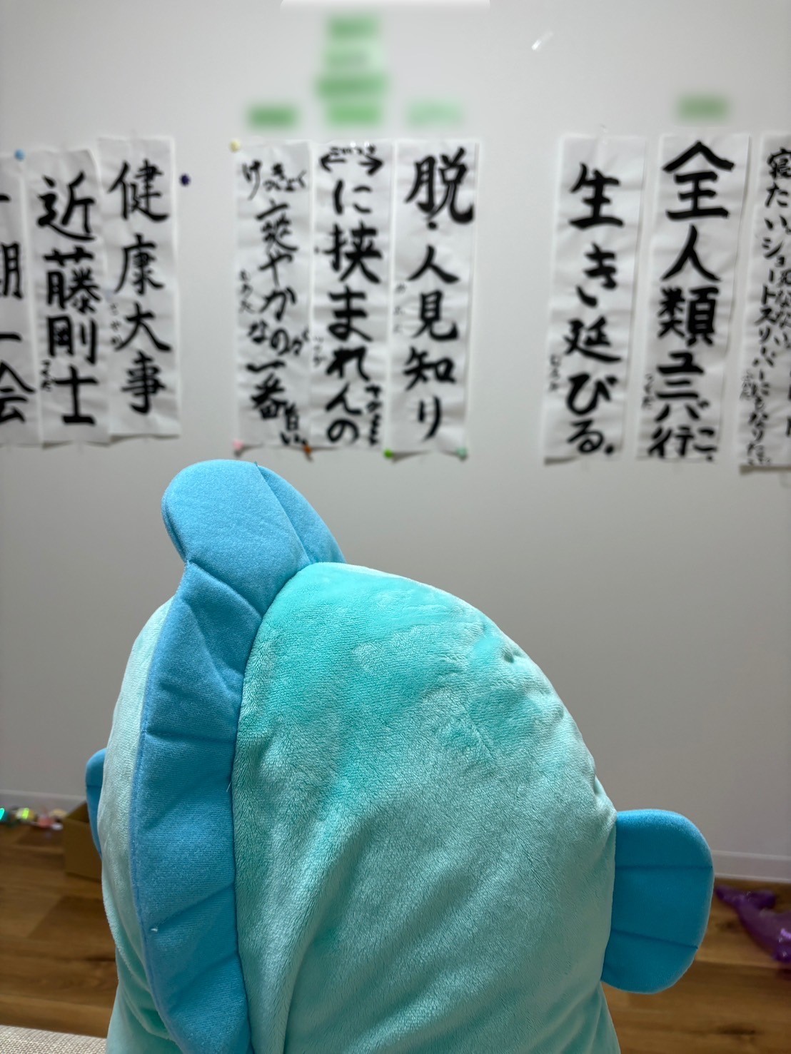 そしてサムネは私たちの部屋で毎月行われる習字と、それを眺めるハンギョドンの図です。かわいいですね。
