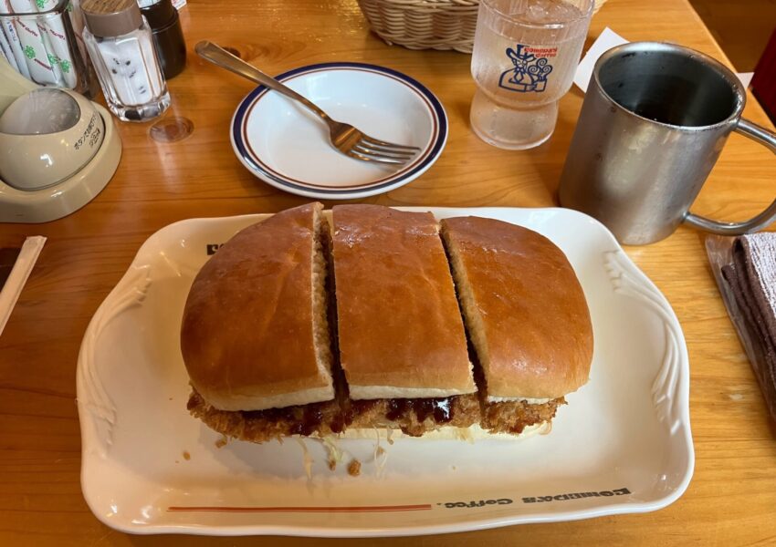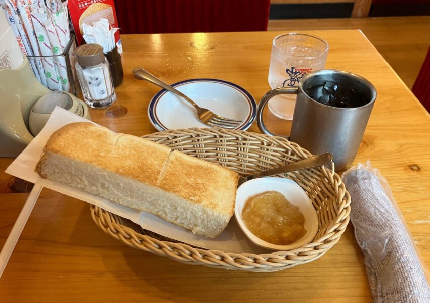 11:00にギリギリ間に合ったので、モーニング(冒険のバナナジャム)とカツパンです。モーニングとカツパン1切れの時点で「もうちょうどいいんじゃないか?」と思いましたが、一日のスタートでコケるわけにはいきません。余裕でした。