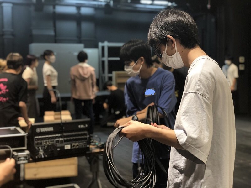 照明では灯体ごとの特徴を学んだり、静思堂シアターでのバトンへの仕込み、小劇場そぞろ座での脚立を使った仕込みを行いました。