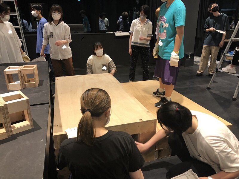 舞台では、ダブルバインド(美術取り付けのときに使うバインド線をねじったもの)や鉄管縛りを習い、図面を描いて実際に平台を組むなどしました。