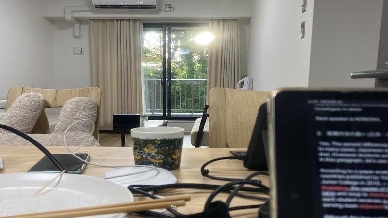 が、1時間もしないうちに眠気が襲ってきて、レポートの前に眠気との闘いが始まります。その闘いに負けて自分の部屋に帰っていく人もいれば、手は動いてないけど眠気と闘い続けている人もいます。そんなこんなで離脱者が2人くらい出たところで、空が明るくなり始めます。朝日は寮の裏にある山王公園から登るので、公園側の部屋の私たちは空の変わり具合が顕著に分かります。今日の空きれいだな〜なんて思っていたら朝日がリビングに差し込みます。