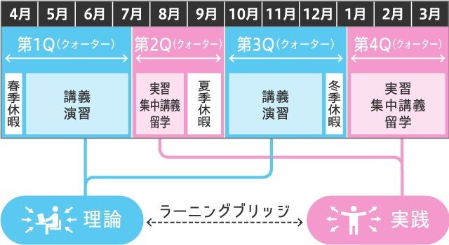 本学では、1年間を4つの期間に分けて、理論と実践を繰り返すシステムとなっており、これをクォーター制と呼びます。
