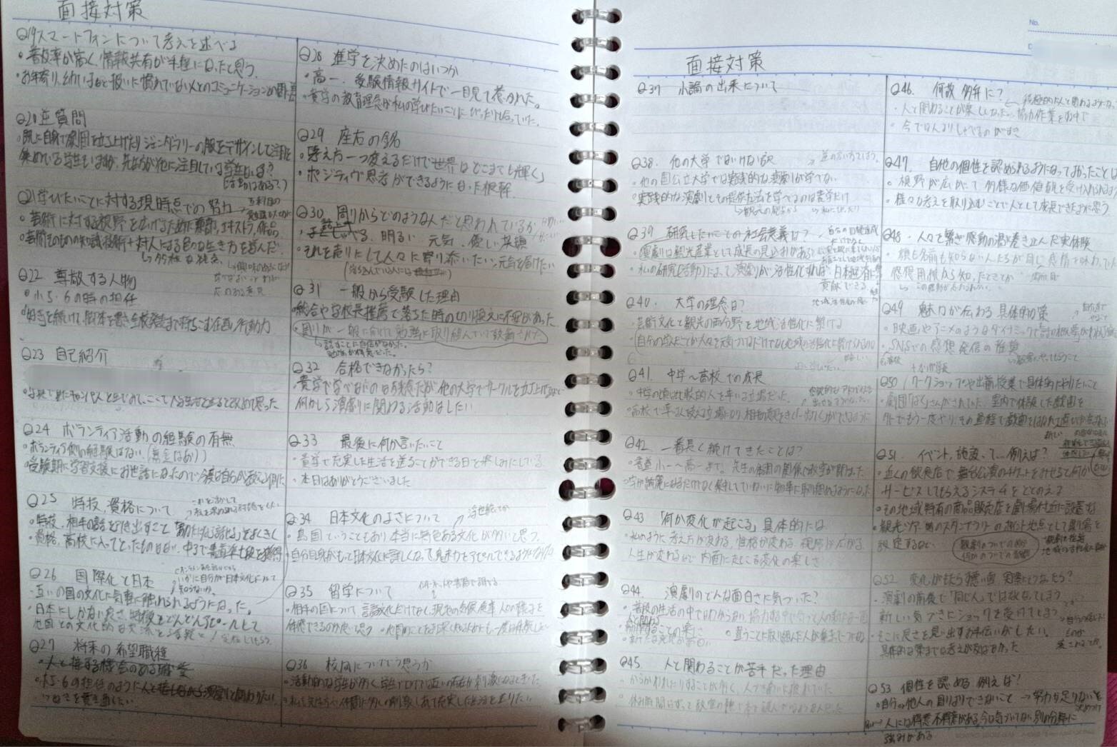 独自戦法の中身はこちら。まずノートにインターネットや学校の数少ない面接練習でもぎ取った質問たち約70問を、一問一答形式でノートに書き起こします。回答は結論と理由を簡潔に。キーワードだけでも良いです。そのあとは質問だけを見て虚空に向かって答えを喋り、直後に書き起した回答を見て自分が要点を簡潔に喋れていたかを確認します。私はやりませんでしたがこれを録音して聞くのも効果的かと。
