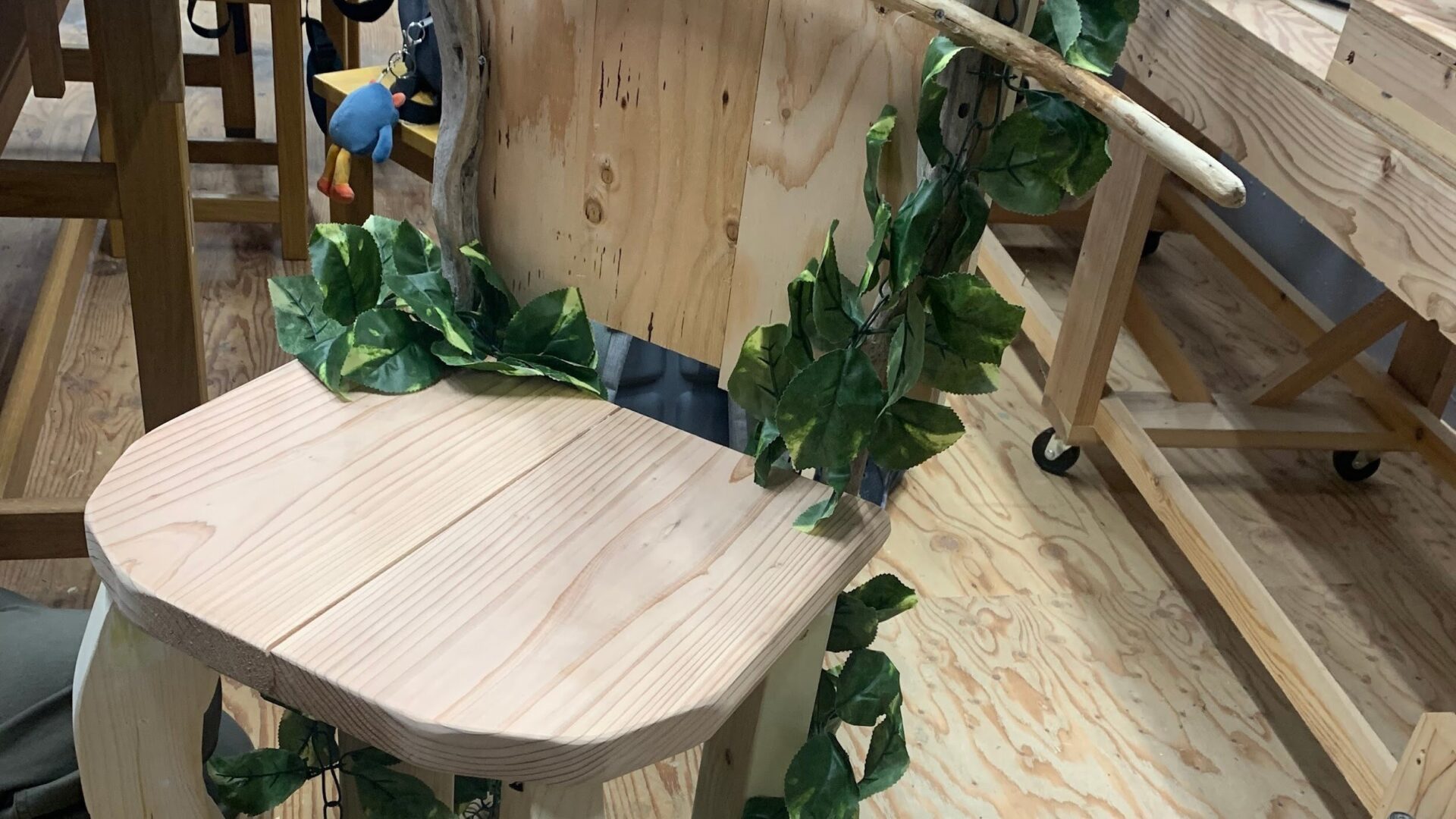 3チームに別れ各チームごとに『セロ弾きのゴーシュ』の舞台を作りました。私は舞台美術として関わり、椅子の作成や小道具の準備をメインに行いました。