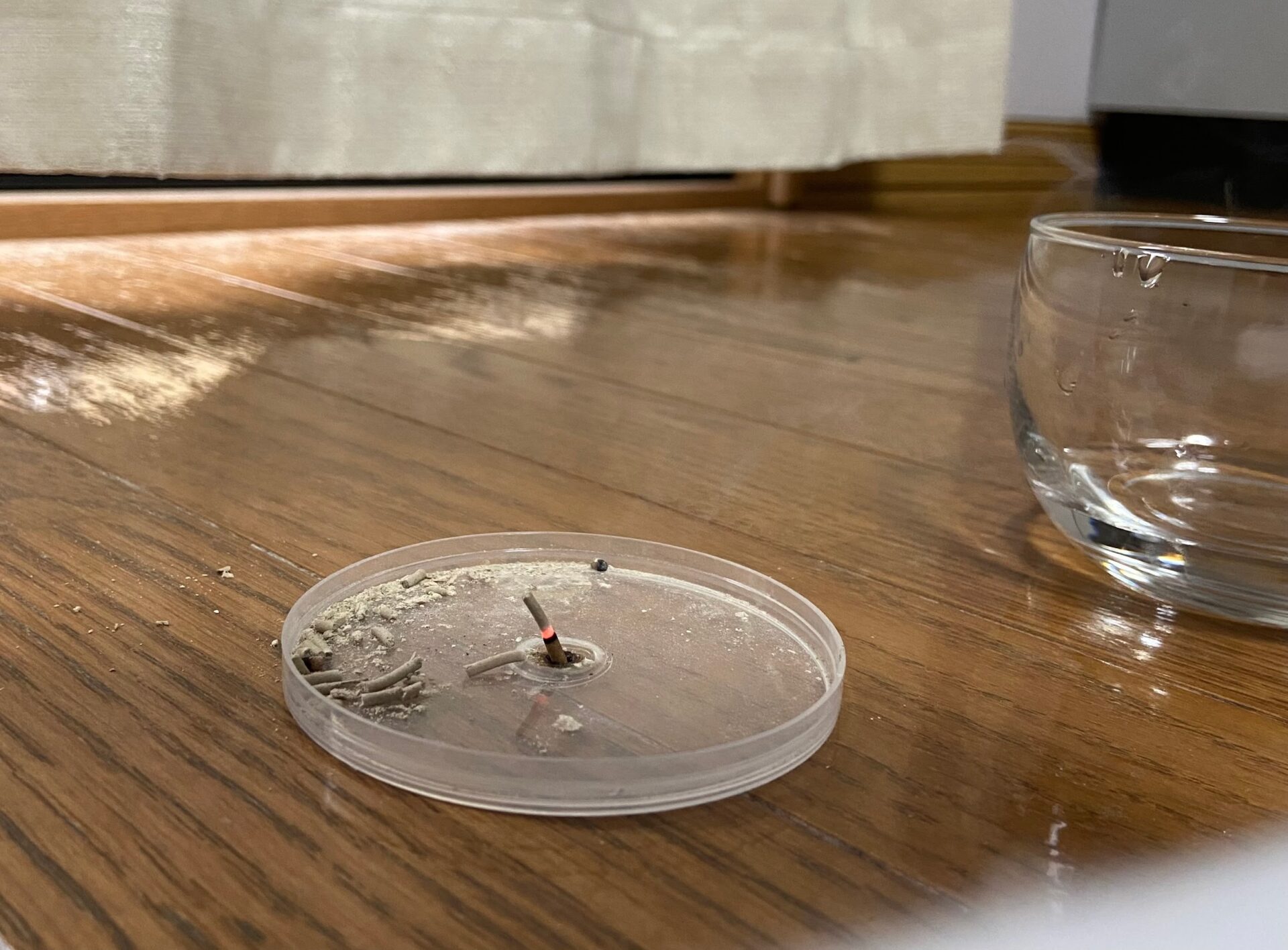 そしてこれを立てるのは、綿棒の蓋に穴を開けて作ったお香立て。生活の知恵をフル活用です。