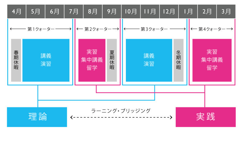- 本学では原則120分(1モジュール60分×2回)で授業が行われます。なお、教育効果を高める観点から、授業によって休憩(10分)の配置が異なります。