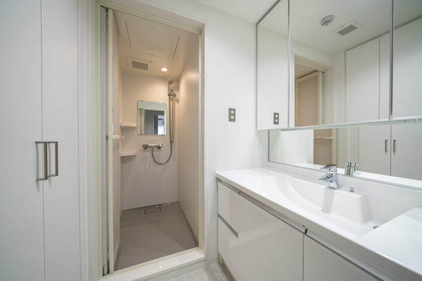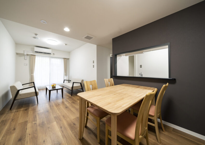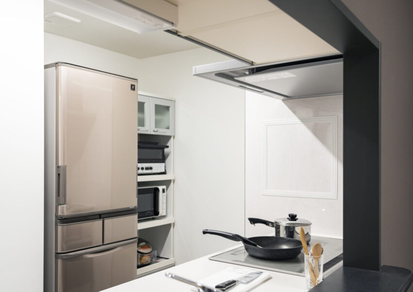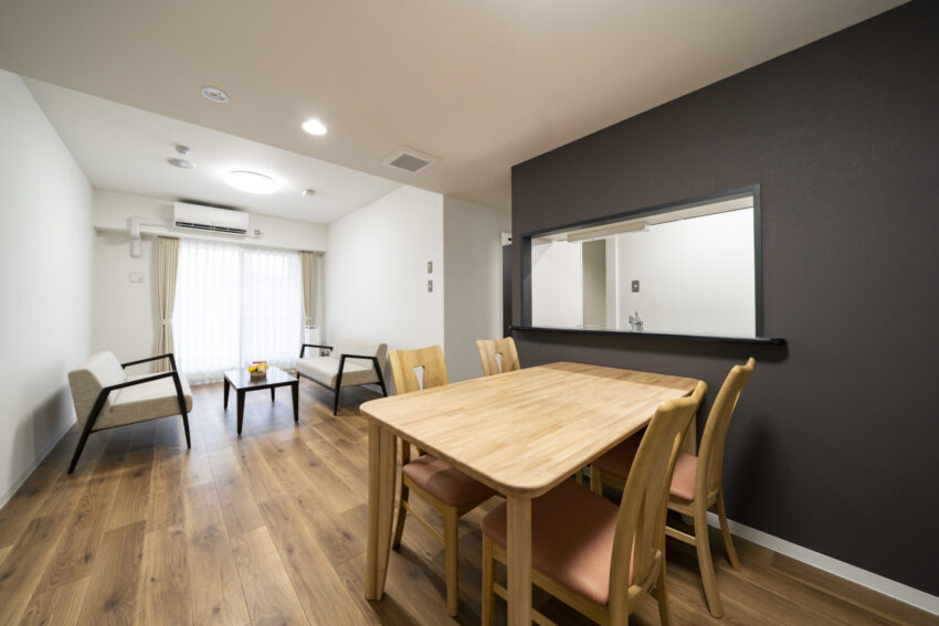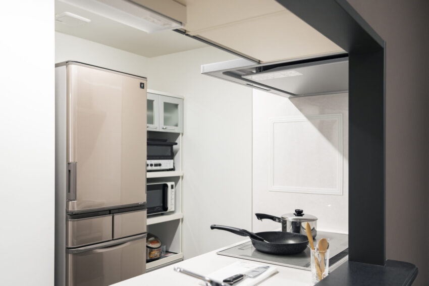 キッチン(IHコンロ、冷蔵庫、炊飯器、電子レンジ、調理器具等)、ダイニングルーム(テーブル、イス)、リビングルーム(テーブル、イス)、トイレ、洗面所、脱衣室、シャワーブース、エアコン