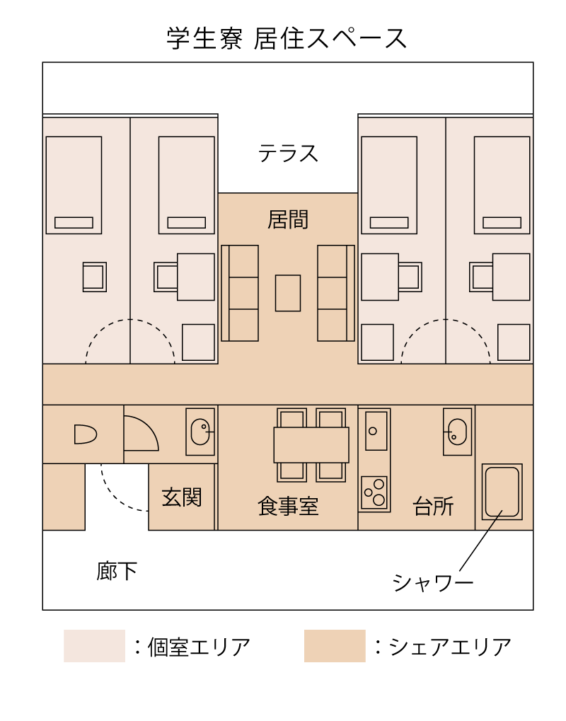 本学では初年次にシェアハウス方式の全寮制を採用しており、それぞれのプライベートを守りながら、学生の学修環境を確保し、学生同士の生活交流を通じて自律性、社会性、コミュニケーション能力が自然と磨かれます。