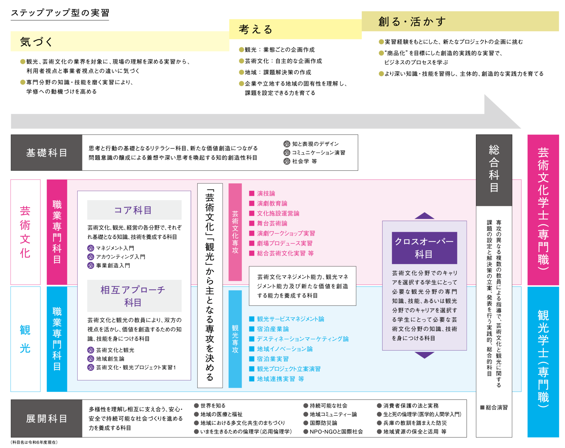 まずは芸術文化と観光、経営の基本を学び、自身の適性や希望する進路をもとに2年次に主となる専攻を選択。