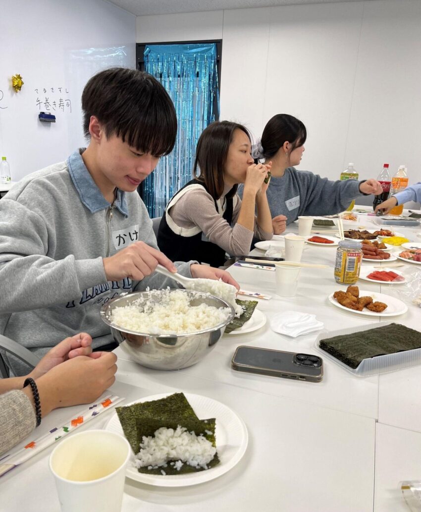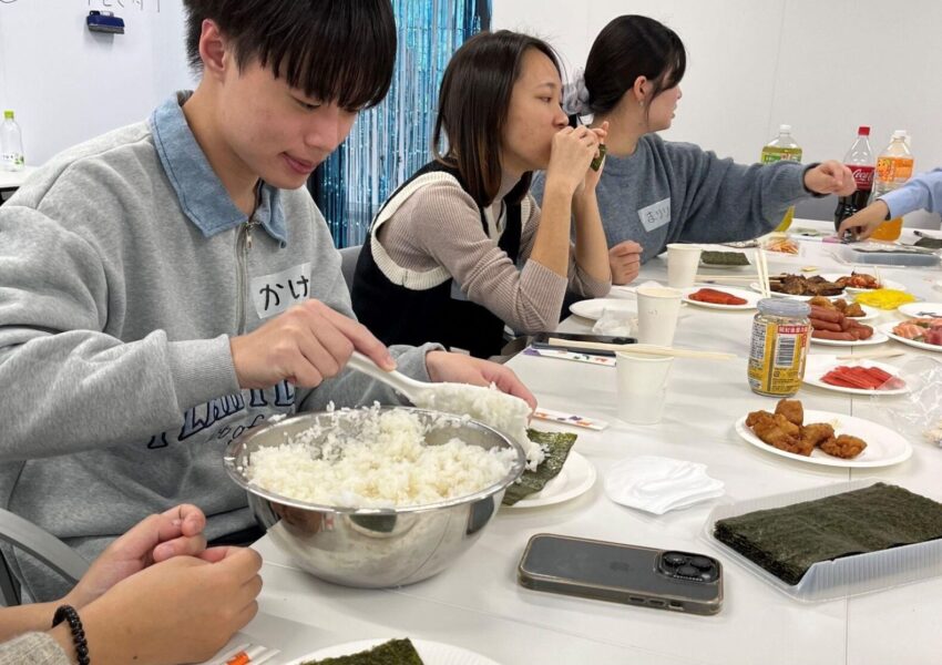 本学の国際交流サークル852Hz(852ヘルツ)が主催となり、留学生4名の歓迎パーティーを開催してくれました。歓迎パーティーでは、みんなで手巻き寿司を作って楽しく食べました。日本人学生にお手本を見せてもらった後、留学生も手巻き寿司作りに挑戦。歓迎パーティーを通して留学生との距離が縮まり、キャンパスでの交流も増えたようです。