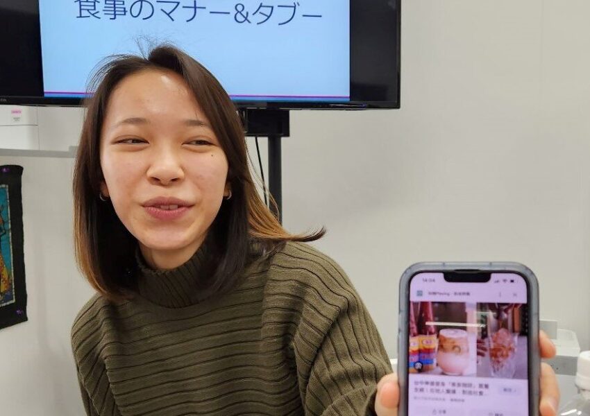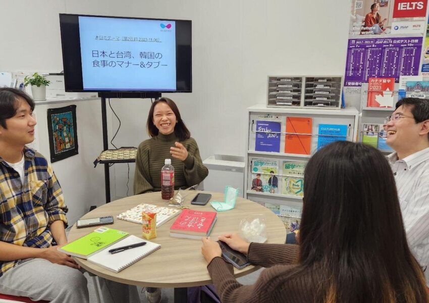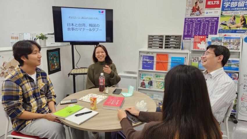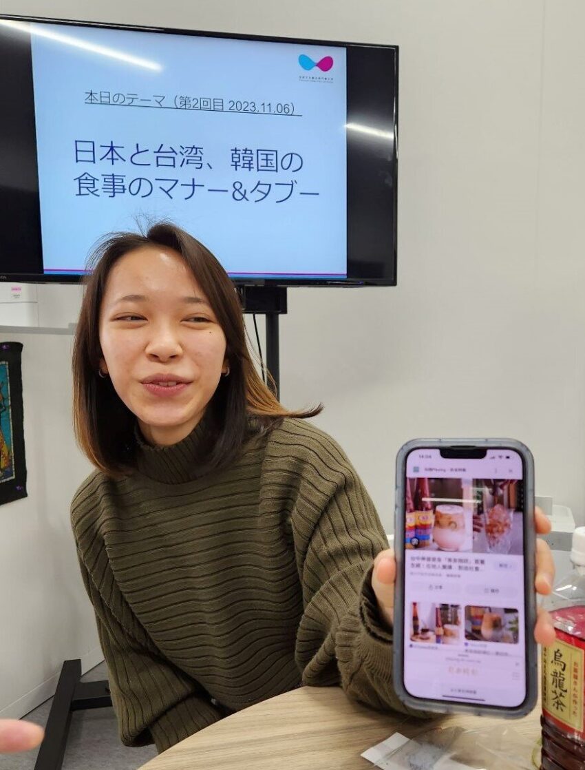 国際交流センターでは、毎週月曜日のお昼休みの時間に、留学生と一緒に様々なテーマのもと楽しくおしゃべりをする時間を設けています。第2回目のテーマは「日本と台湾、韓国の食事マナー&タブー」でした。身近な食事というテーマだったこともあり、大盛り上がり!日本から近い台湾や韓国でも全く違う文化や考え方があることを知りました。今後は日本人の学生にも参加してもらい、留学生と日本人学生が気軽に交流できる場所になればいいなと思っています。