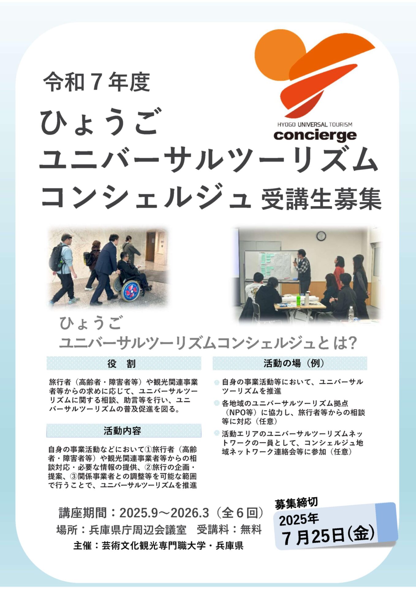 旅行者や観光事業者からの相談に対応するなど、ユニバーサルツーリズムの普及促進を図る人材(コンシェルジュ)を育成する「ひょうごユニバーサルツーリズムコンシェルジュ育成プログラム」の受講生を下記のとおり募集します。