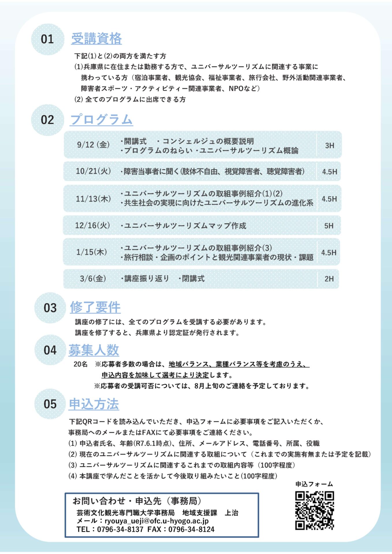 | 申込方法 | 下記リンクより必要事項をフォームに入れ申込してください。 必要事項:申込者氏名、年齢(R7.6.1 時点)、住所、メールアドレス、電話番号、所属または勤務先、役職、現在のユニバーサルツーリズムに関する取組について(これまでの実施有無または予定を記載)、ユニバーサルツーリズムに関連するこれまでの取組内容等(100 字程度)、本講座で学んだことを活かして今後取り組みたいこと(100 字程度) 事務局へメールまたはFAXにて |