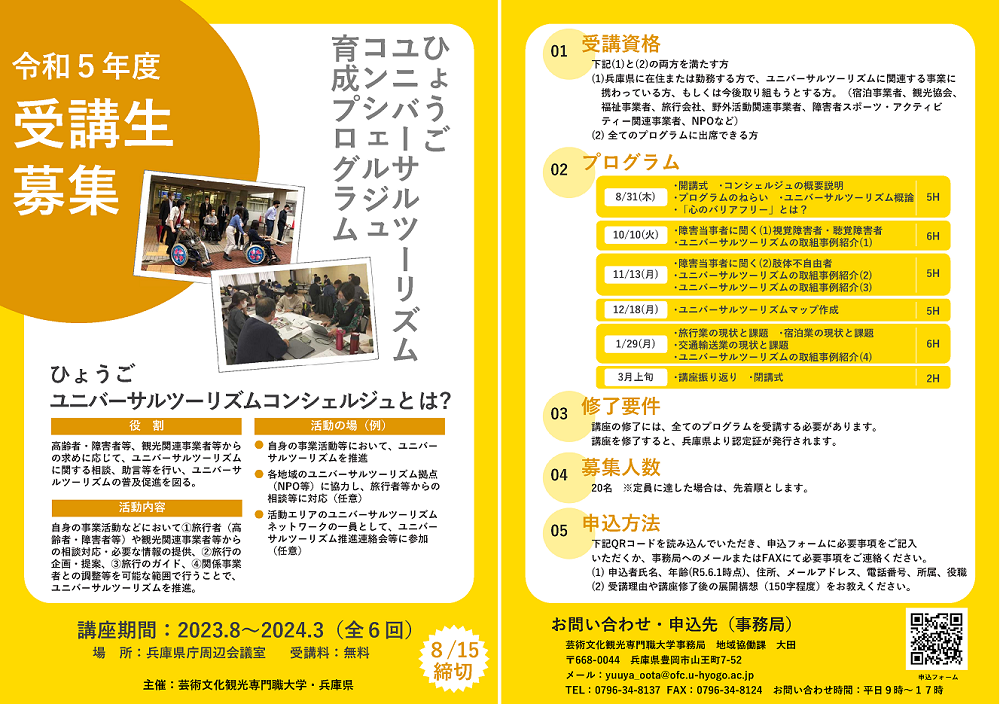 高齢者・障害者等、観光関連事業者からの相談に対応するなど、ユニバーサルツーリズムの普及促進を図る人材(コンシェルジュ)を育成する「ひょうごユニバーサルツーリズムコンシェルジュ育成プログラム」の受講生を下記のとおり募集します。