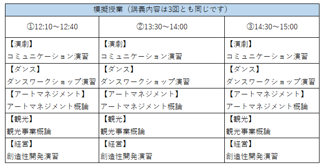 | 内容 | ・大学紹介 ・模擬授業(演劇、ダンス、アートマネジメント、観光、経営分野の5講義) 1講義30分 ・進学個別相談会 1組15分 ・キャンパスツアー 20分程度 ・教員紹介 | |