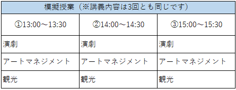 | 内容 | ・大学紹介 ・模擬授業(演劇、アートマネジメント、観光分野の3講義) 1講義30分 ・進学個別相談会 1組15分 ※施設の広さ・収容人数の関係上、保護者の方は「進学個別相談会」のみ参加可能です。 |