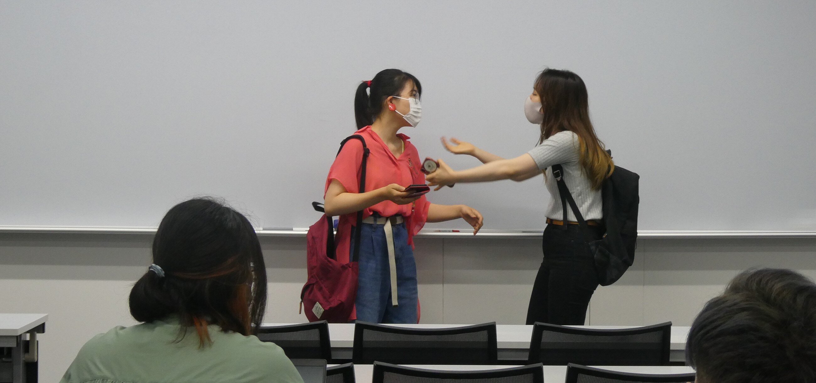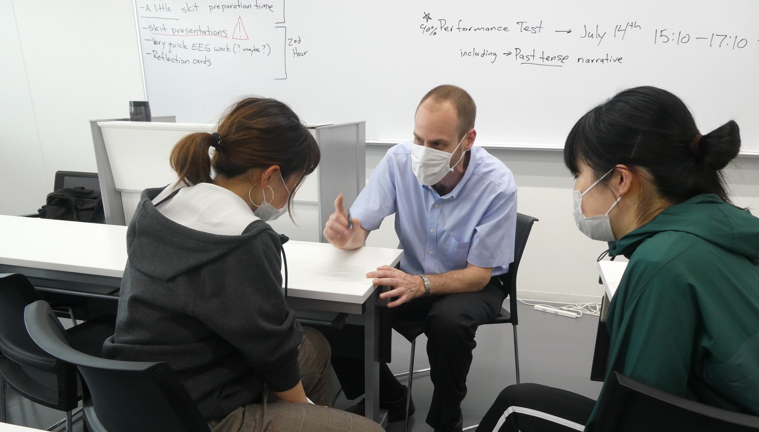 この日の授業では、学生同士がペアを組み、オリジナルの脚本を英語で作成しました。