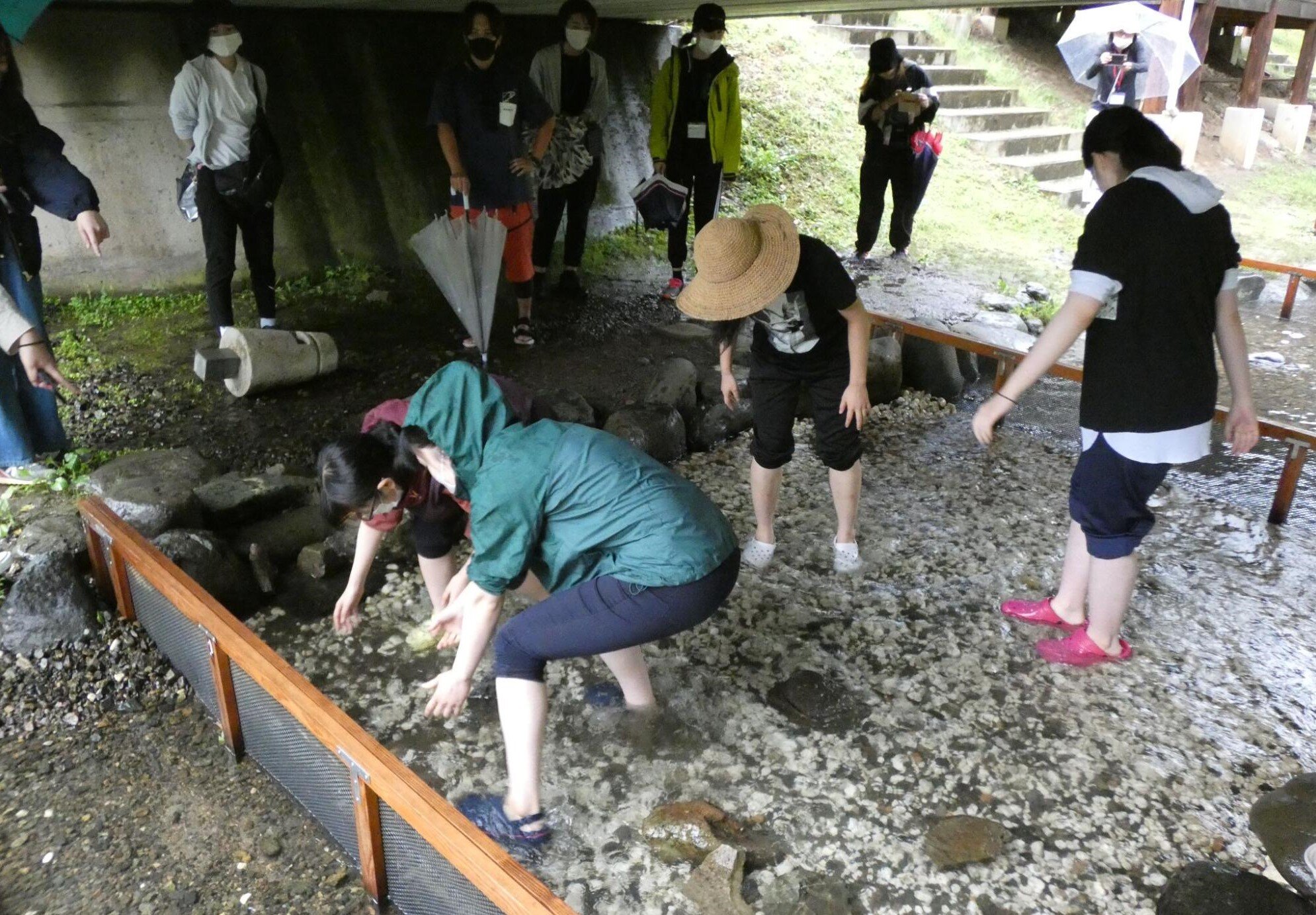 5日間のプログラムの初日は、関連する周辺施設の見学からスタートしました。先ずは「あゆ公園」から。養殖されている鮎を管理施設に放し、つかみ取りに挑戦しました。その後は施設の方に指導して頂きながら、鮎の塩焼きを堪能。あまりの美味しさに骨以外何も残さなかった学生もいたほどです。