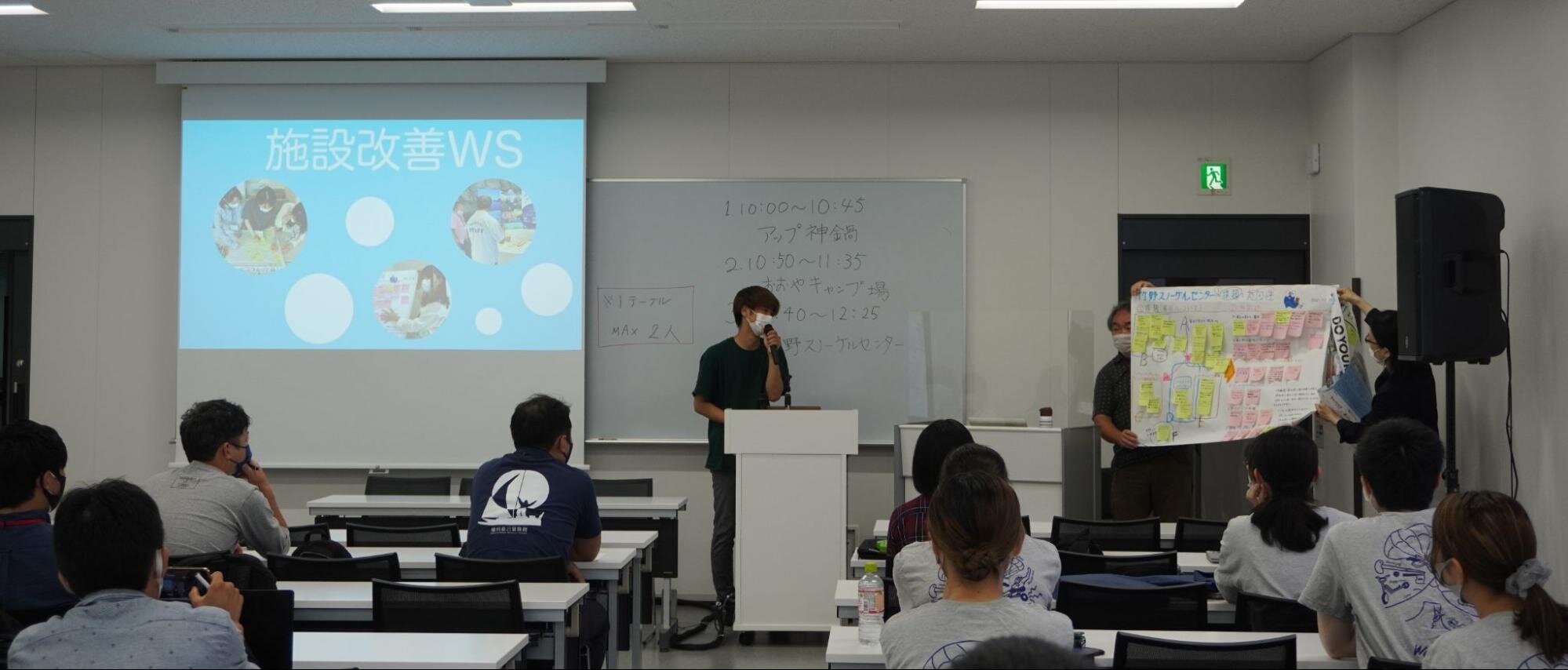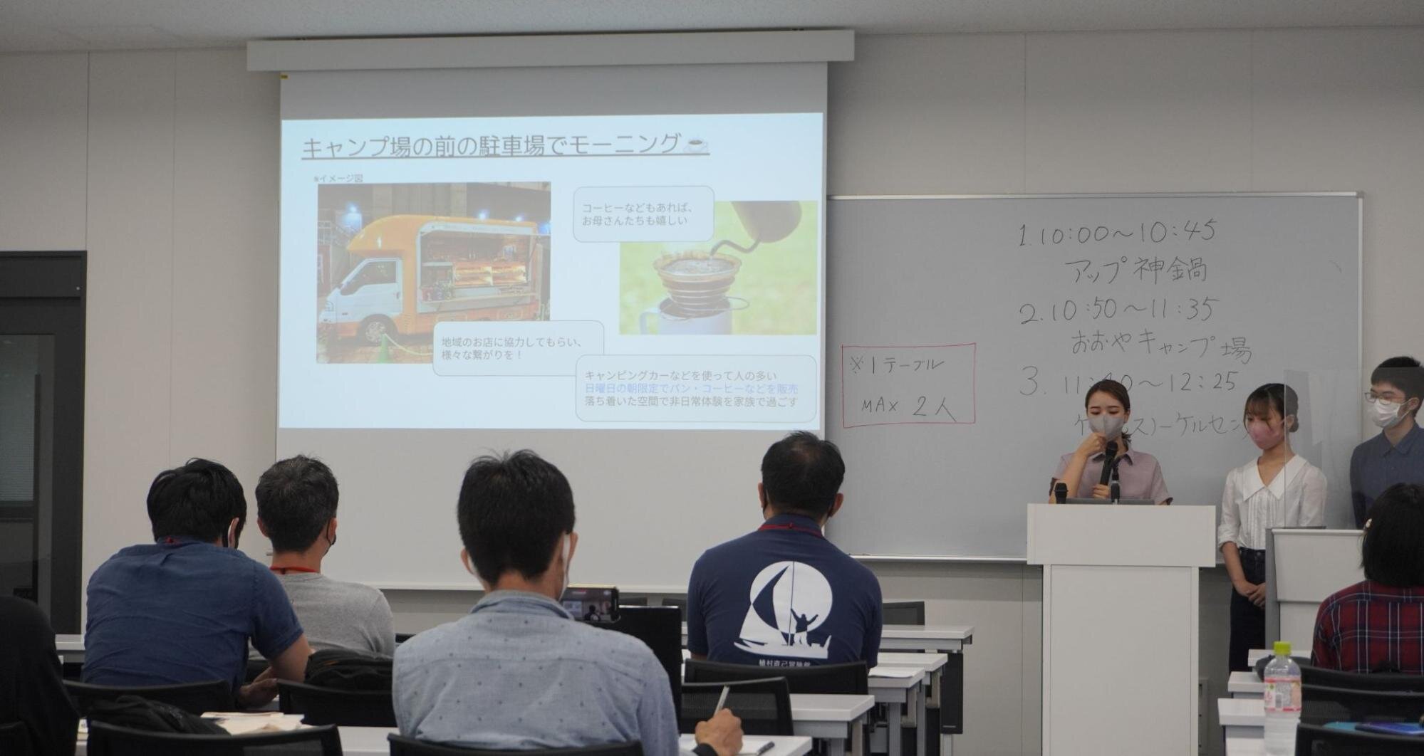アップかんなべチームは植村直己冒険館とキャンプ場の2つの班に分かれて発表を行いました。それぞれの場所の掲げる問題点や解決策を学生の視点から考え、実際のお客様からのインタビュー等も含めて約30分間プレゼンテーションを行いました。質疑応答の後には実習先の担当者の方から温かいコメントを頂きました。
