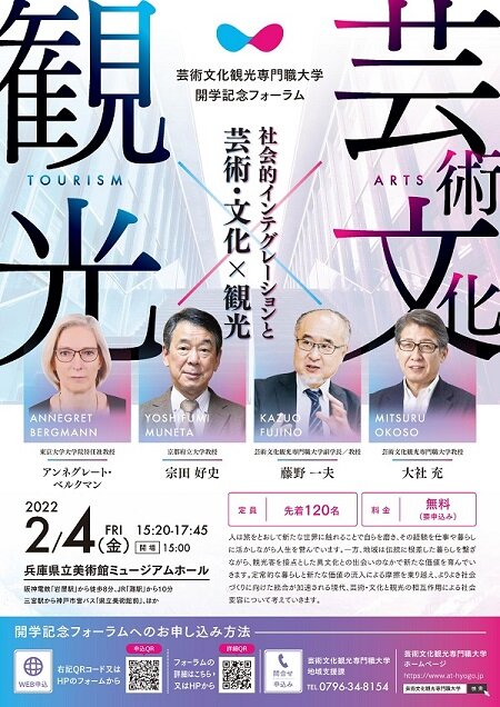 2/4(金)に予定していました開学記念フォーラム「社会的インテグレーションと芸術・文化×観光」につきましては、新型コロナウイルス感染症の拡大に伴い、兵庫県にまん延防止等重点措置が適用されたことから、延期することにいたしました。