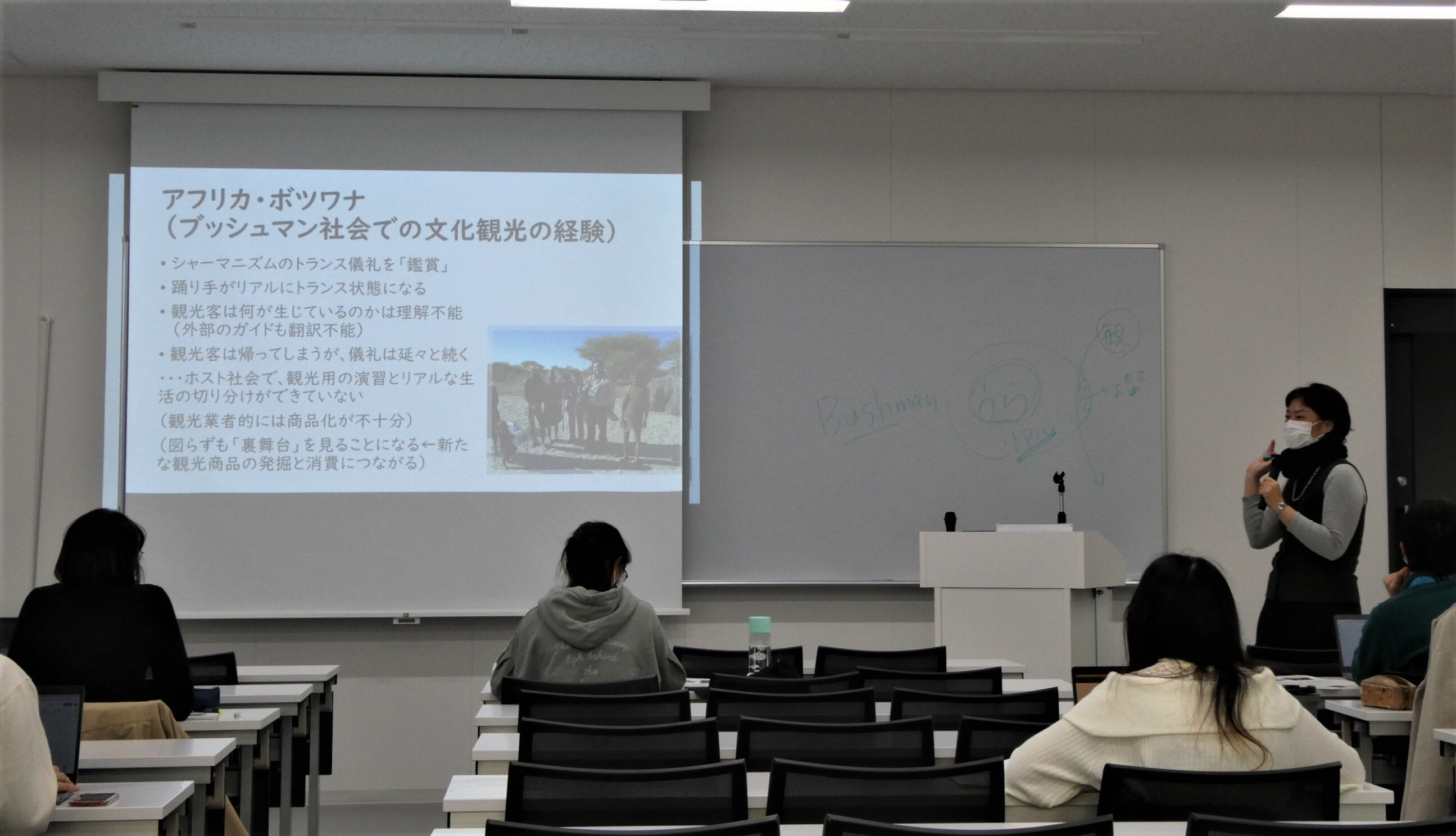 例として、教員が研究でアフリカのボツワナを訪れた際に、文化観光を体験した話がありました。内容はシャーマニズムの儀式を鑑賞するというものでしたが、途中、儀式をしていた方がトランス状態(陶酔したような状態)に陥り、観光客は何が起こっているのか分からない事態になったそうです。これはホスト社会で、観光用とリアルな生活を切り分けていないことを意味しています。観光の商品化が不十分であるととらえることもできるし、観光と生活を切り分けることがホスト社会にとって良いことなのか、という問いを立てることもできます。