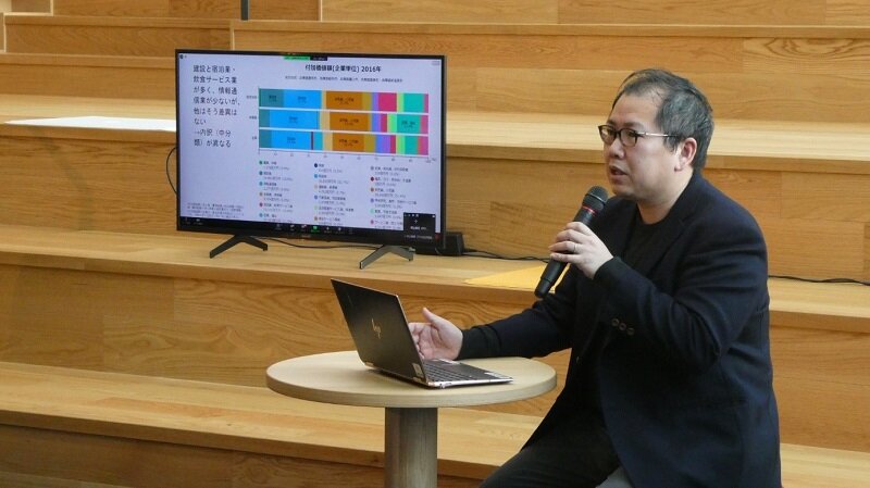 「報告1」では、本学の大社充教授が産業連関表を用いて但馬の経済状況を解説し、域内のお金の流れを見据えたうえで産業政策を組み込んでいくことの重要性を説明しました。