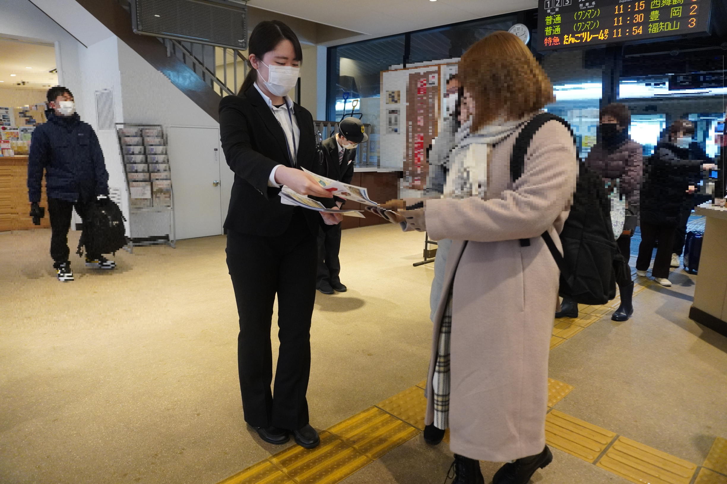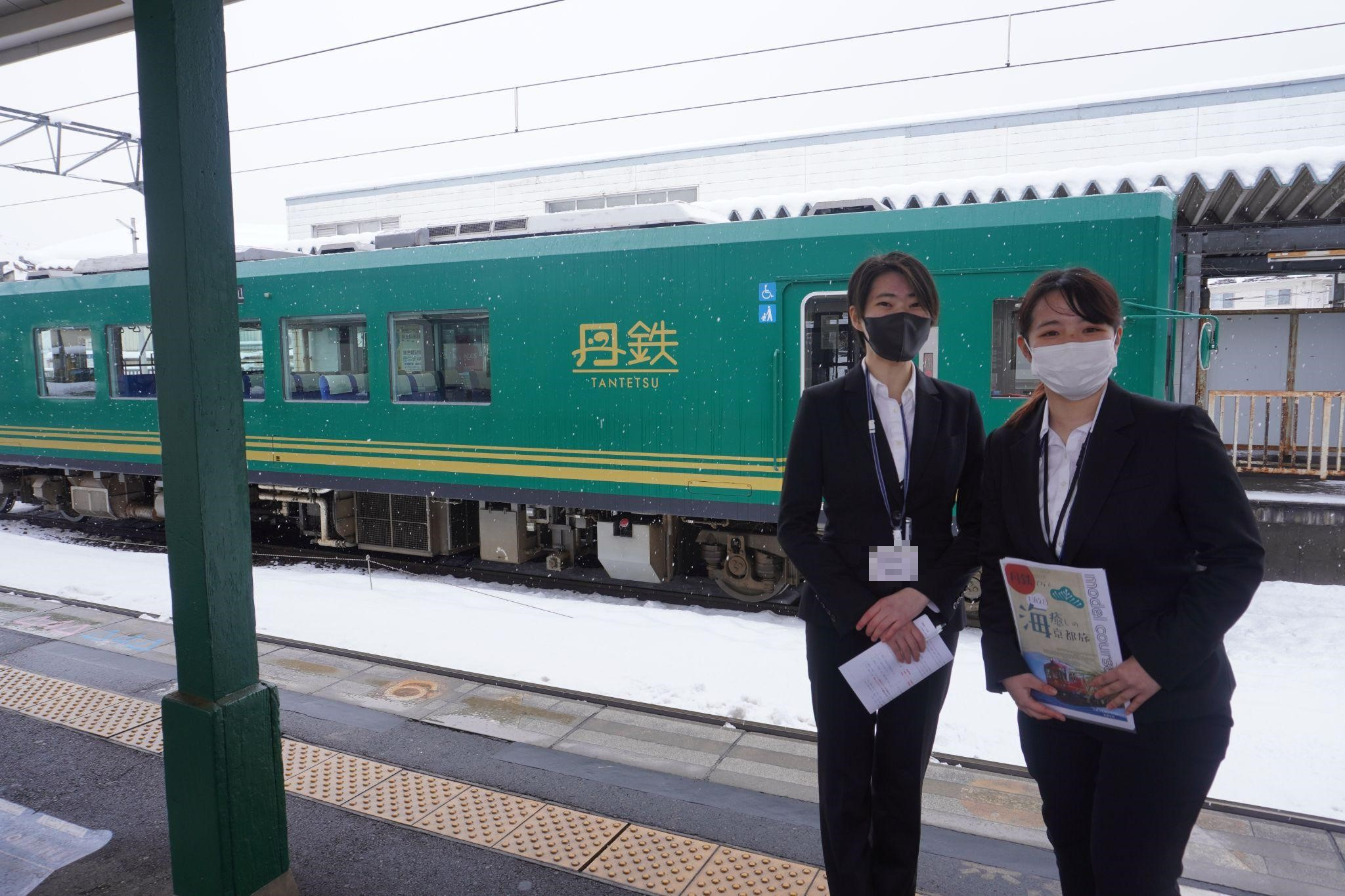 そのチラシを天橋立駅で特急電車から降りてこられた観光客の方に直接お渡し、丹後地域の魅力発信を行いました。
