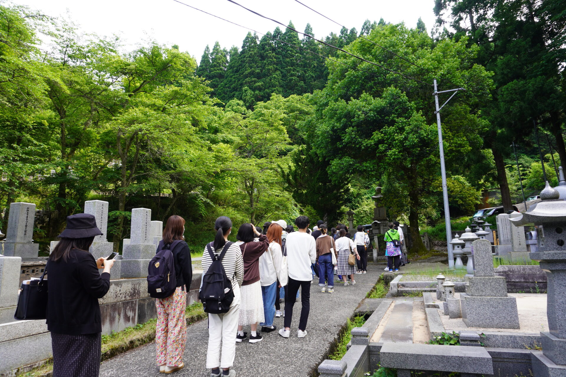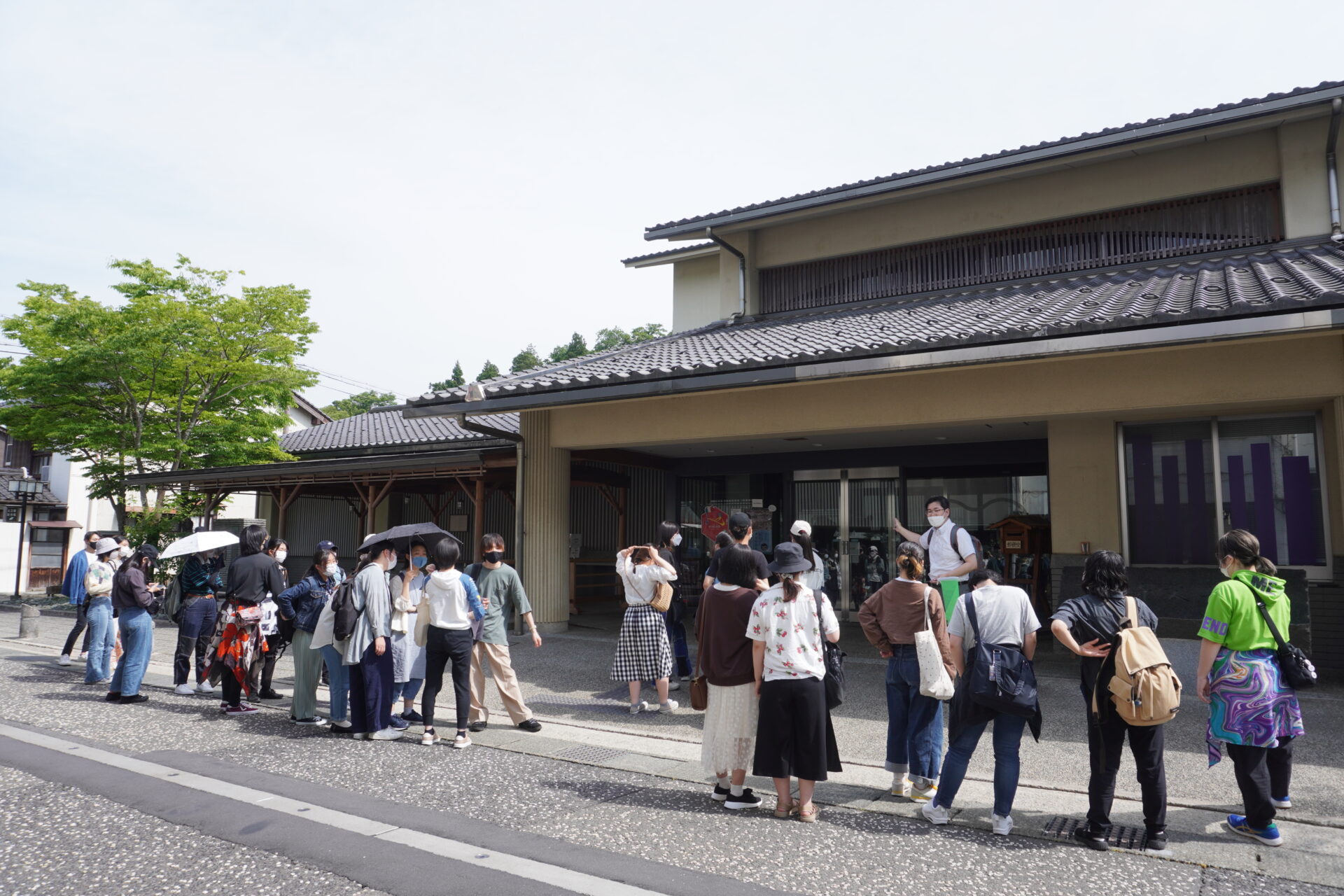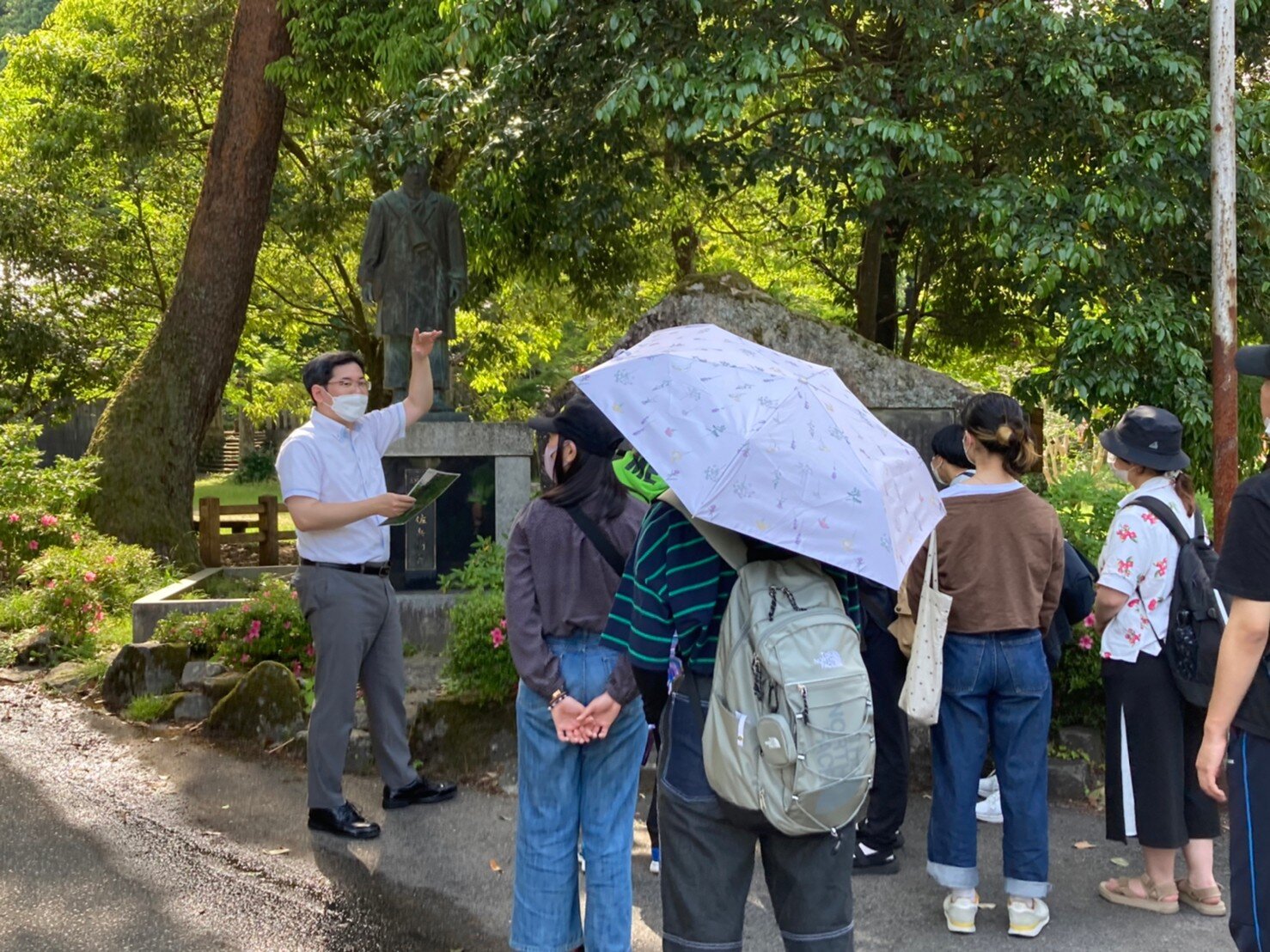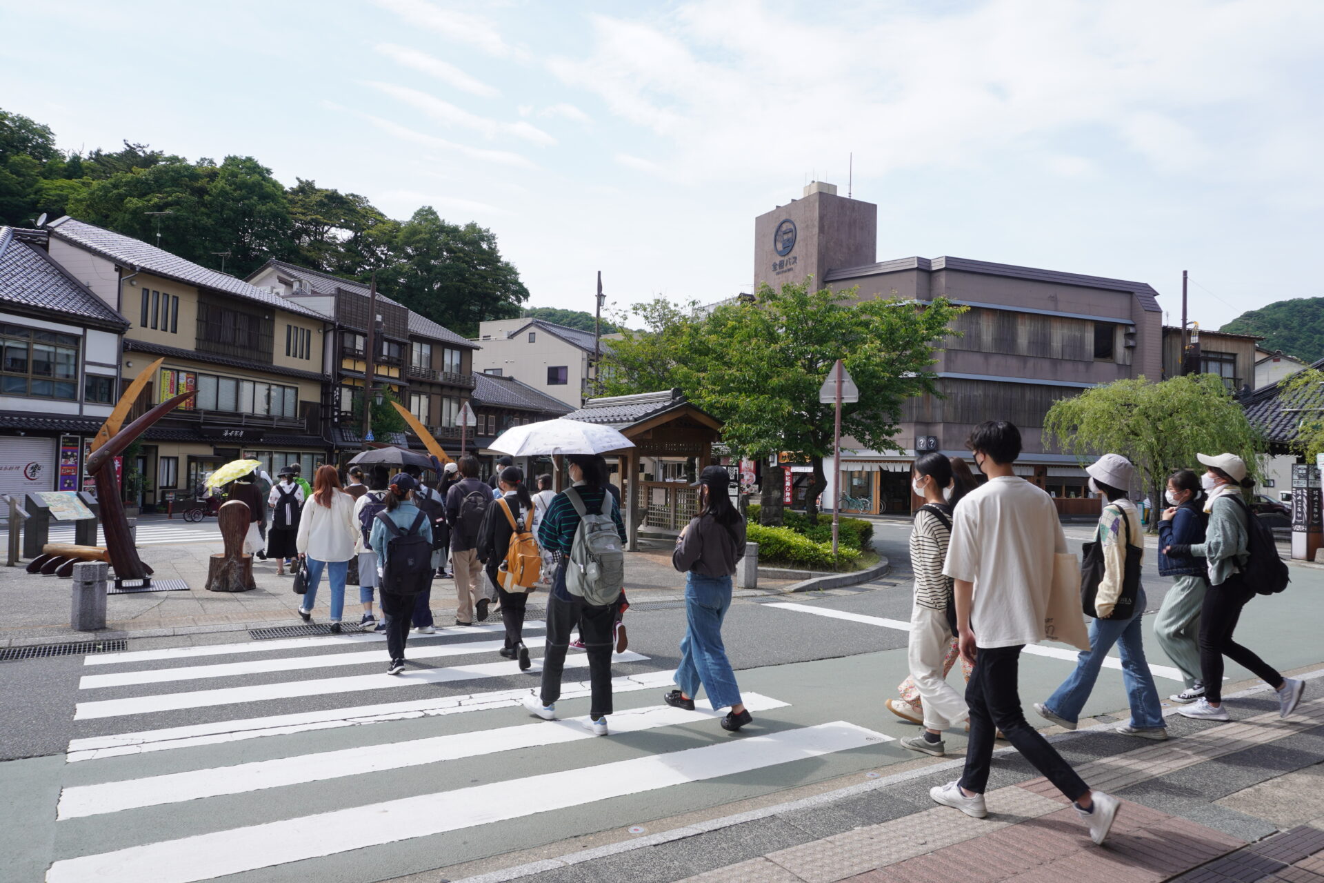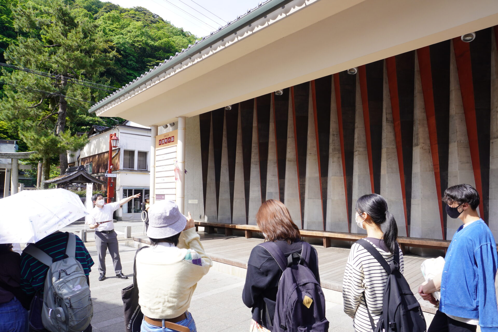 この日は、城崎温泉に残っている1925年の北但大震災の跡を見に行く学外学修の日でした。城崎温泉駅から出発し、温泉寺までの約1kmの間にある様々な地震の跡を見学します。