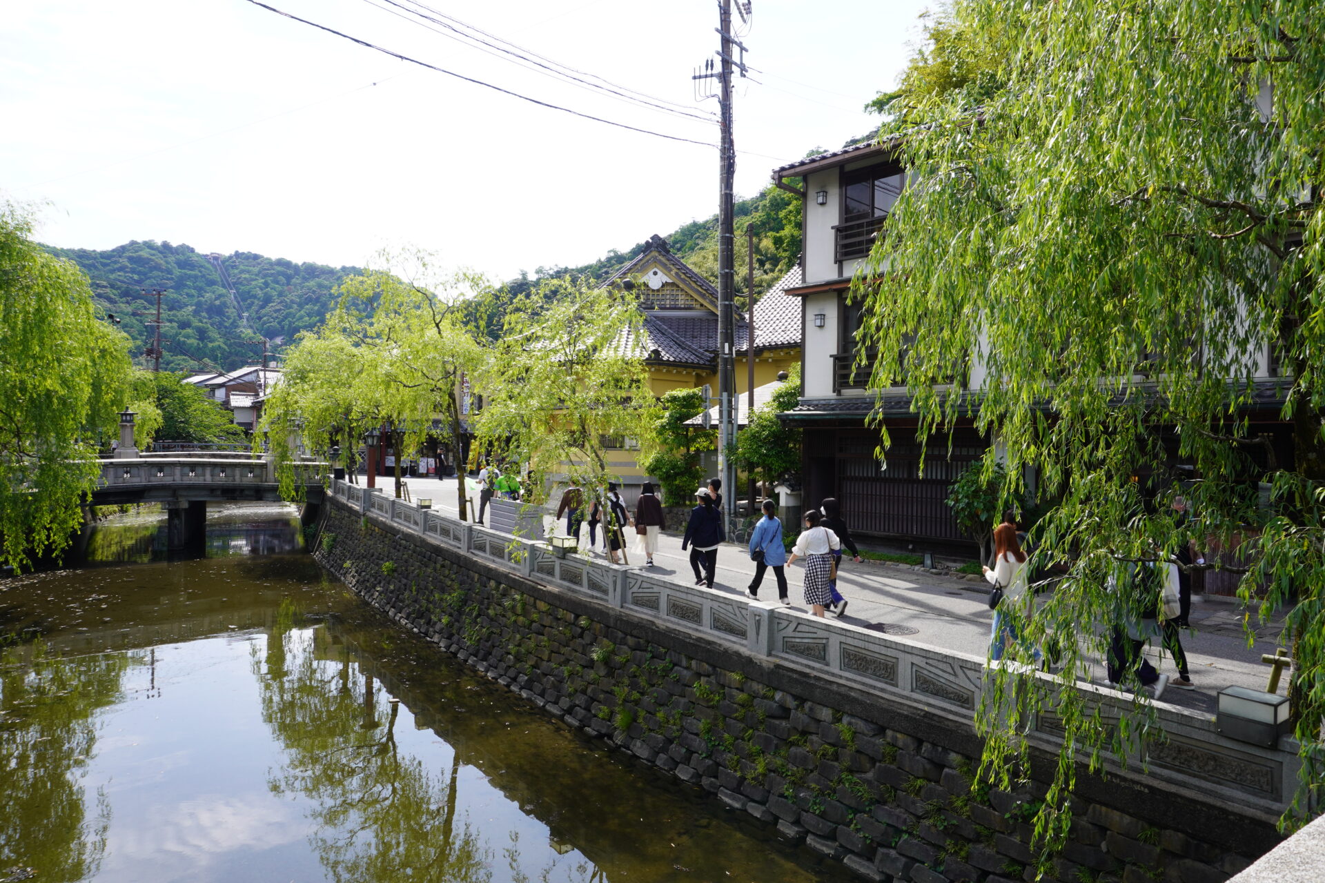 城崎温泉と言えば、この大谿川(おおたにがわ)にかかる愛宕橋と柳並木を思い浮かべる方が多いと思います。この愛宕橋も実は、北但大震災の復興時に建設されたものだそうです。また、大谿川の護岸壁には、玄武岩が用いられており、これらも同じく震災によって崩れた玄武洞(豊岡市赤石)の玄武岩を船で運び利用したそうです。