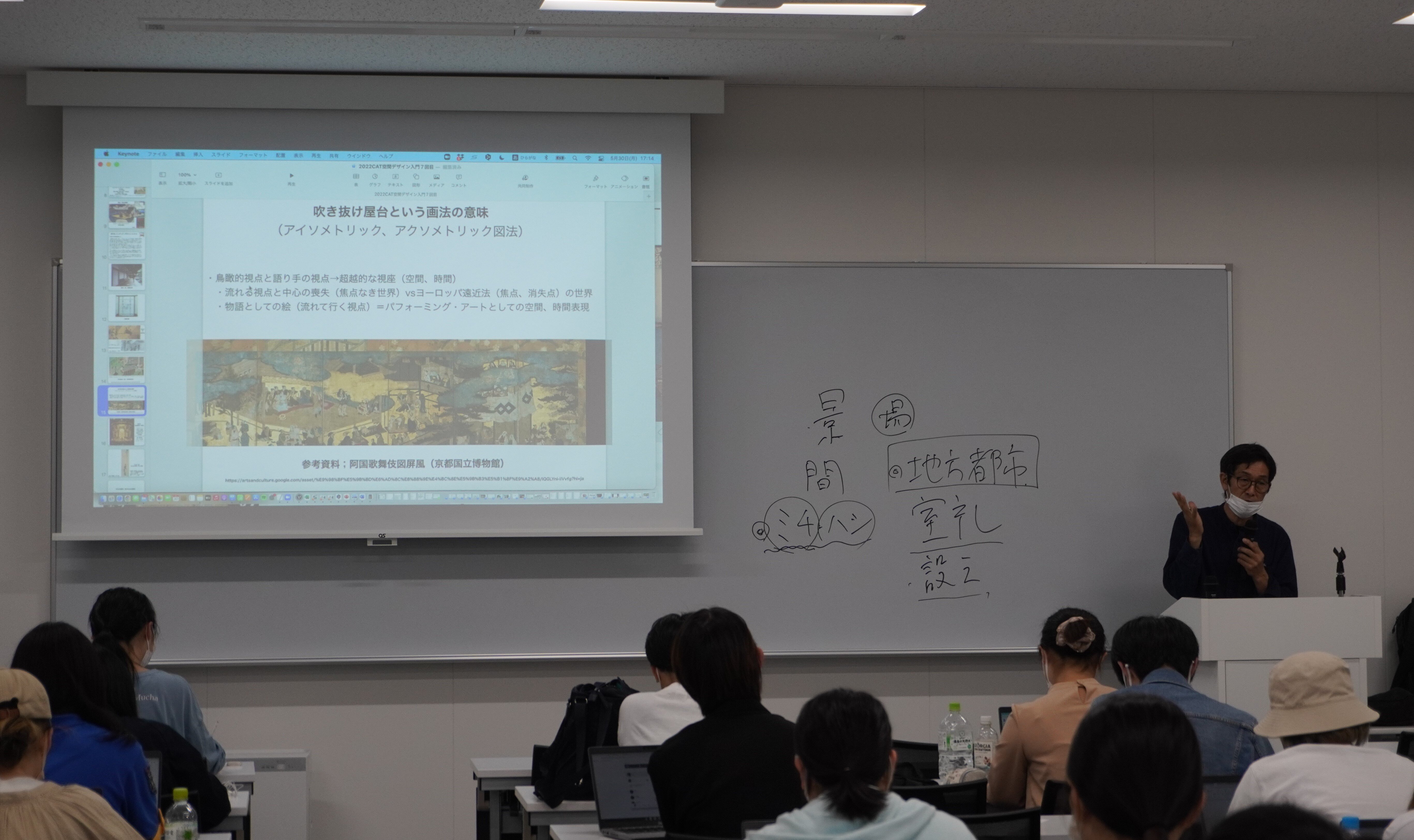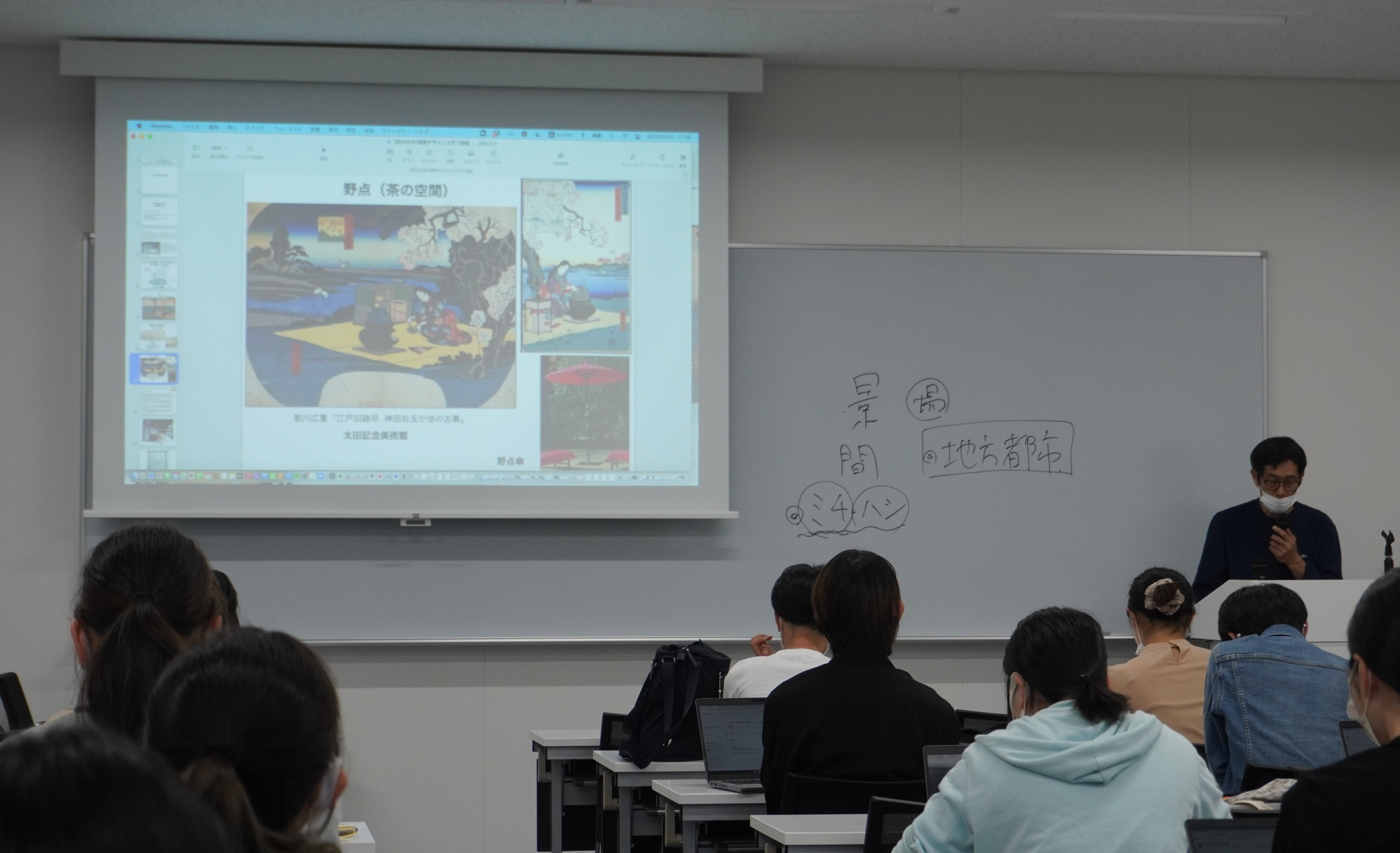 講義の前半では、教員から「景」「間」「ミチ」「ハシ」について解説がありました。これらの概念は日本の芸能空間の原初であり、古い絵画にも多く用いられています。教員が様々な具体例を挙げて解説しながら、日本の空間概念について理解を深めました。