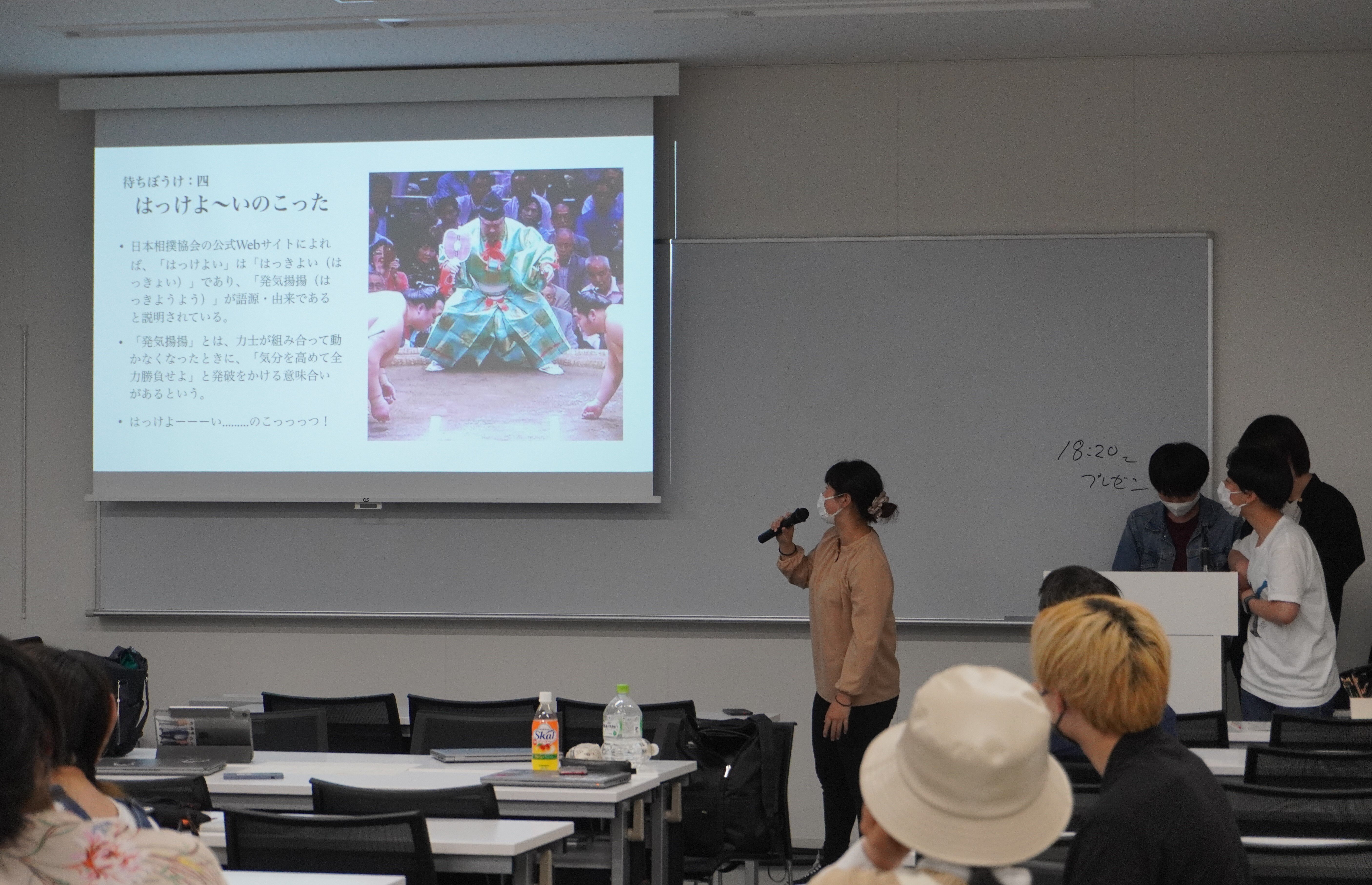 相撲の「はっけよーい、のこった」という掛け声については、元は取り組んでいない相撲を早く取り組ませるための掛け声だったようです。その点を取り上げ、早く取り組ませる為の掛け声が、取り組みを「待つ」という「間」の役割になっていることについての矛盾点等を挙げながら、分析していました。
