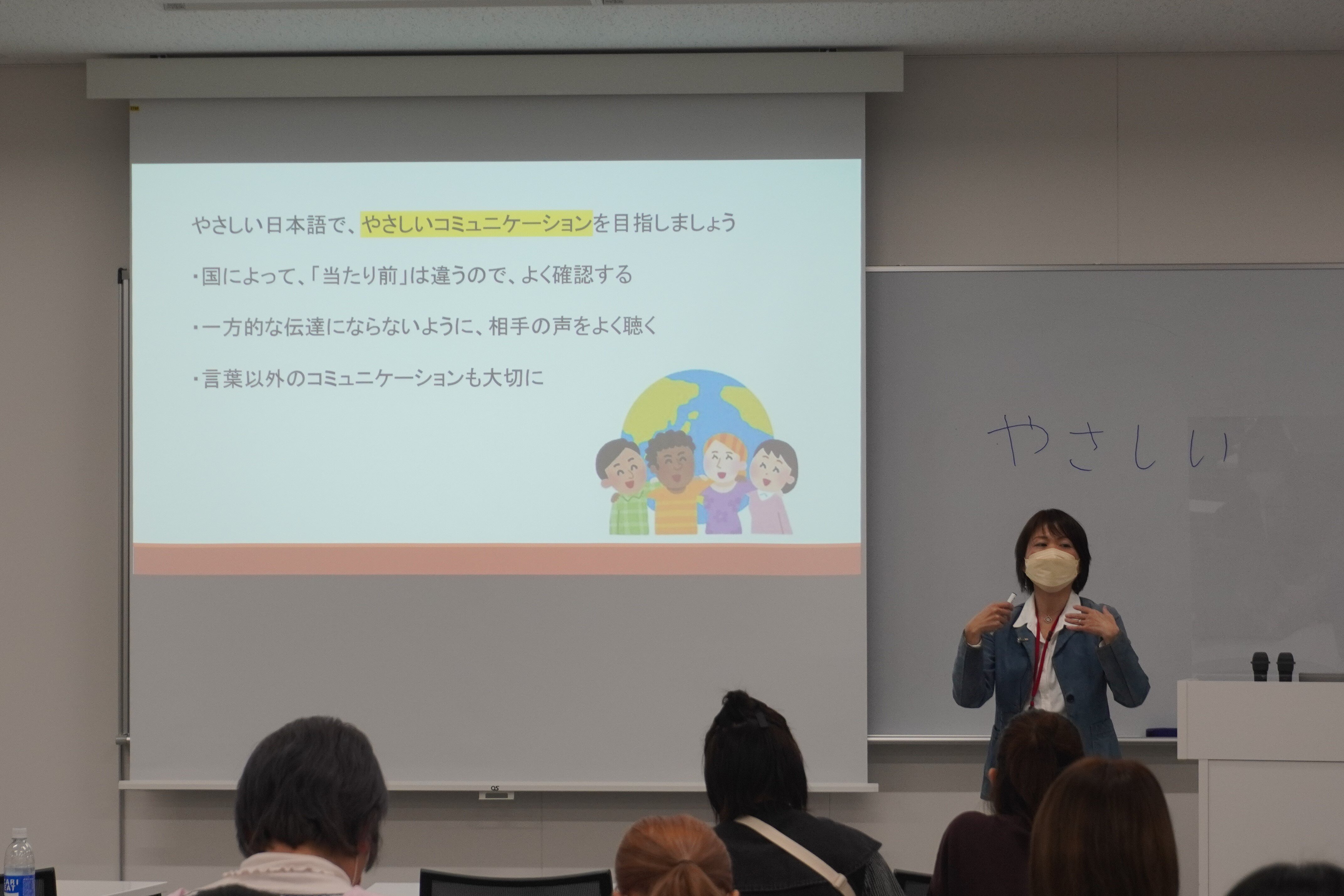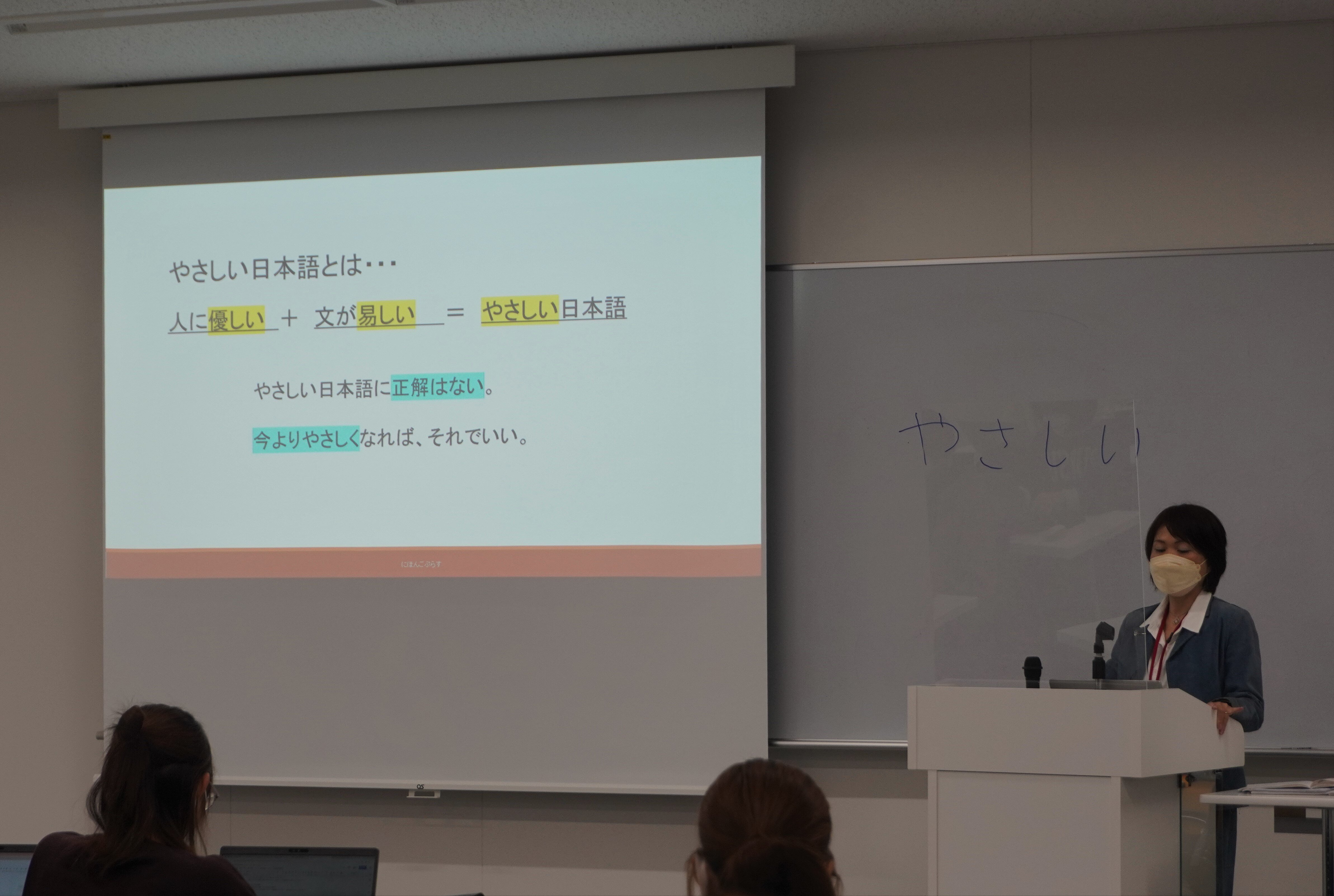 今回の講義テーマは「やさしい日本語の基礎知識と話し方のコツを覚えよう」でした。やさしい日本語とは、人に優しいこと・文が易しいことを意味しています。やさしい日本語に正解はなく、今よりもやさしい言葉を使うよう心がけることが大切とのことです。