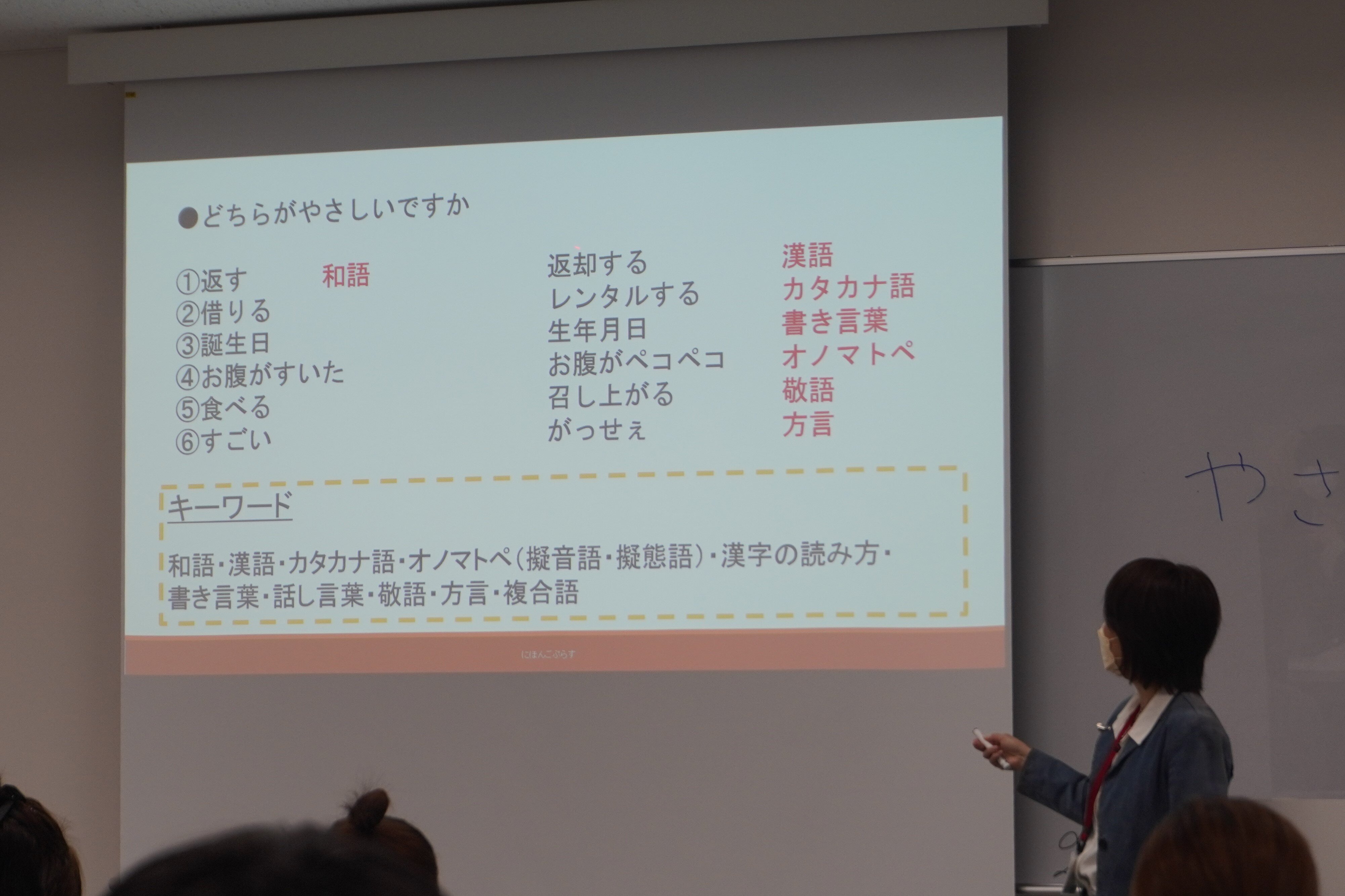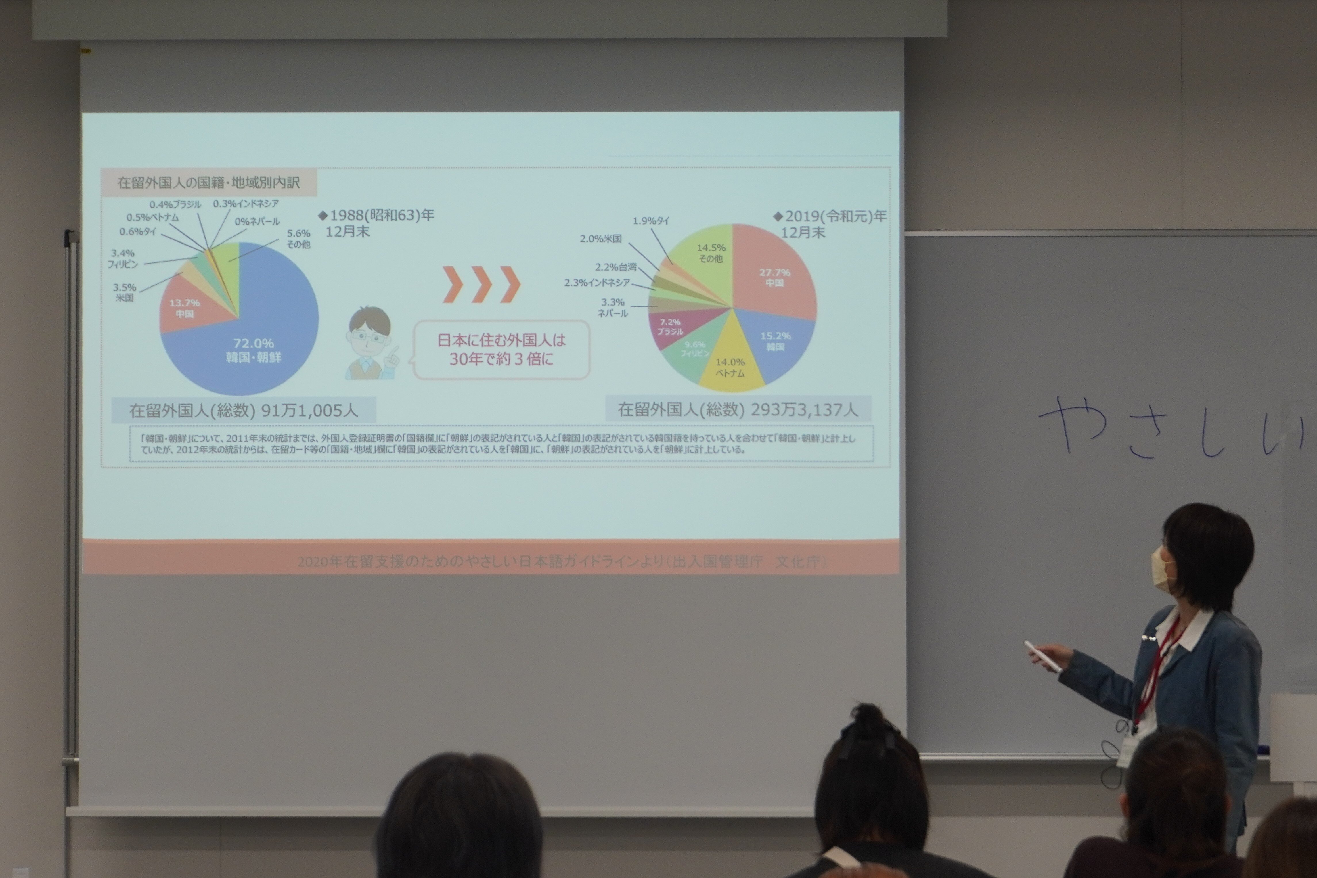 日本に住む外国人は30年間で約3倍に増えており、彼らが使う言語は、公用語上位10位の中で9言語にも及ぶそうです。統計によると、外国人が日常生活に困らない言語としては英語よりも日本語の割合が高いため、日本に住んでいる外国人にはやさしい日本語で話しかける方が言葉が理解しやすいと教員から説明がありました。