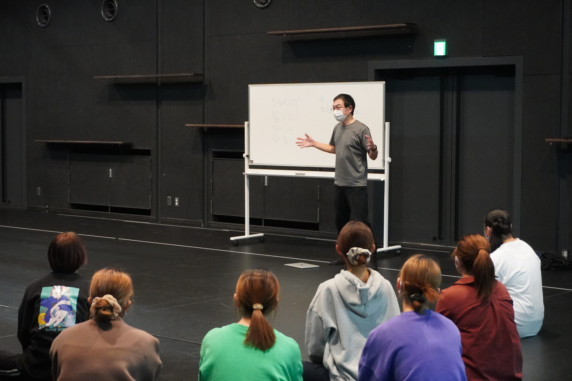 ジョギング後、スタジオでストレッチと発声を行いました。基本的なストレッチから始まり、徐々に発声を意識したストレッチへとうつっていきます。顔の筋肉をほぐすストレッチでは、右側から強風が吹いた時の顔や全てを中心に寄せる顔など、普段使わない顔の筋肉を動かしました。