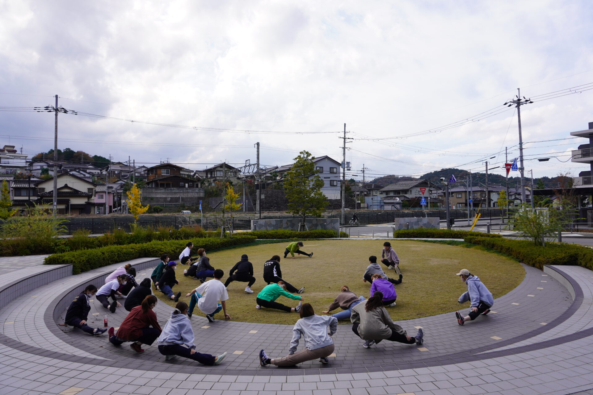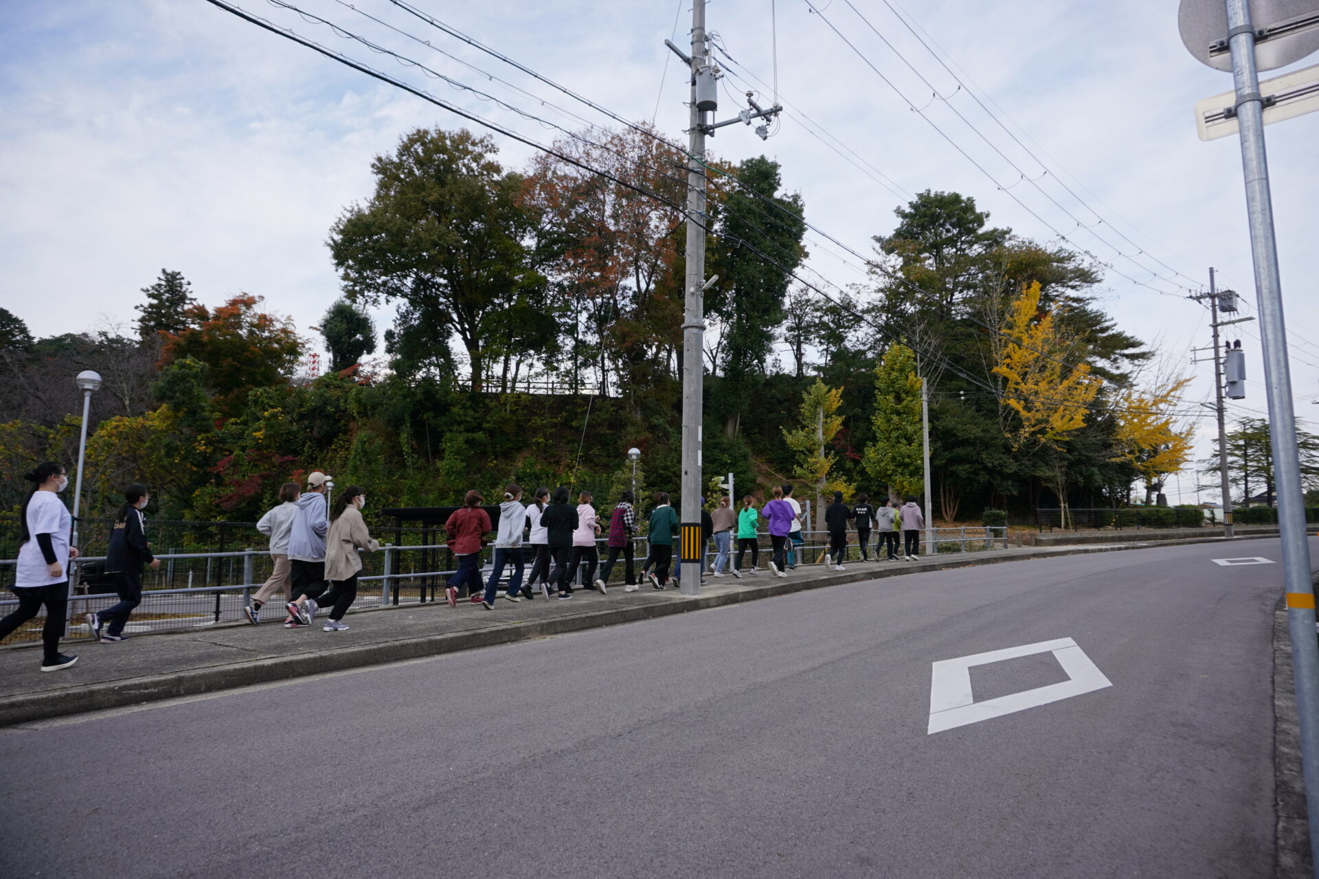 この日の授業では、実際に教員の本番前ルーティンを学生達も行ってみました。まずはジョギングからです。出発前に大学前の広場でしっかりとストレッチをします。大学近くの神武山(じんむさん)まで教員を先頭にジョギングをしました。教員からは、自分のペースで走ること、疲れたら歩いてもいいので、とにかく無理をせずに自分で調節するようにと指示がありました。