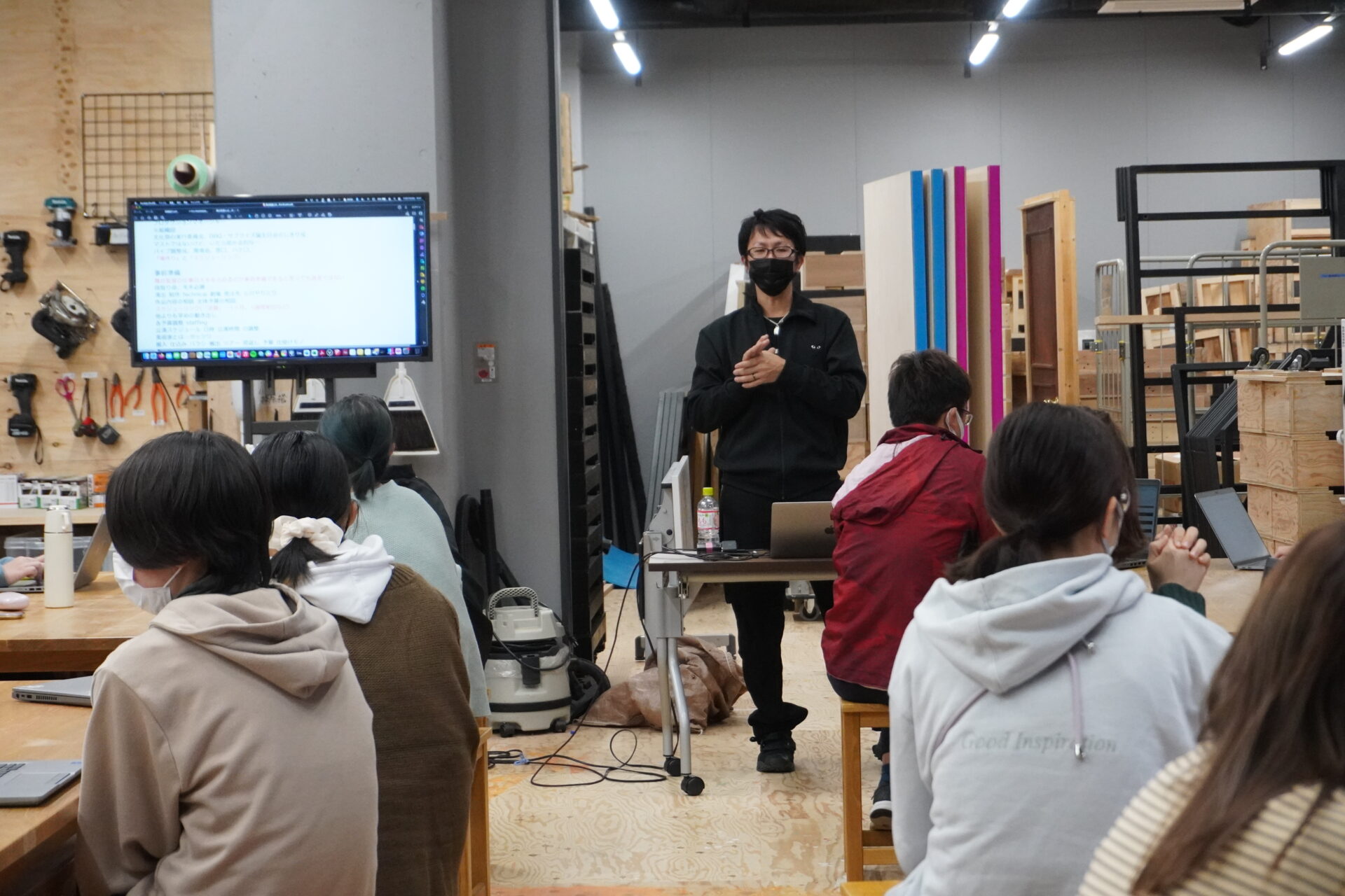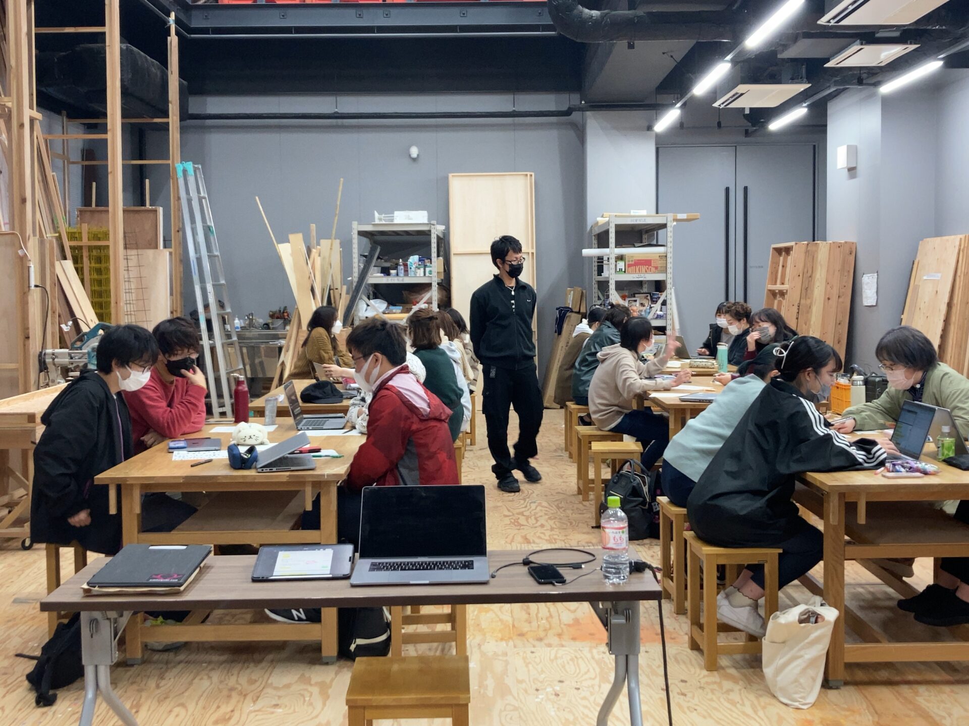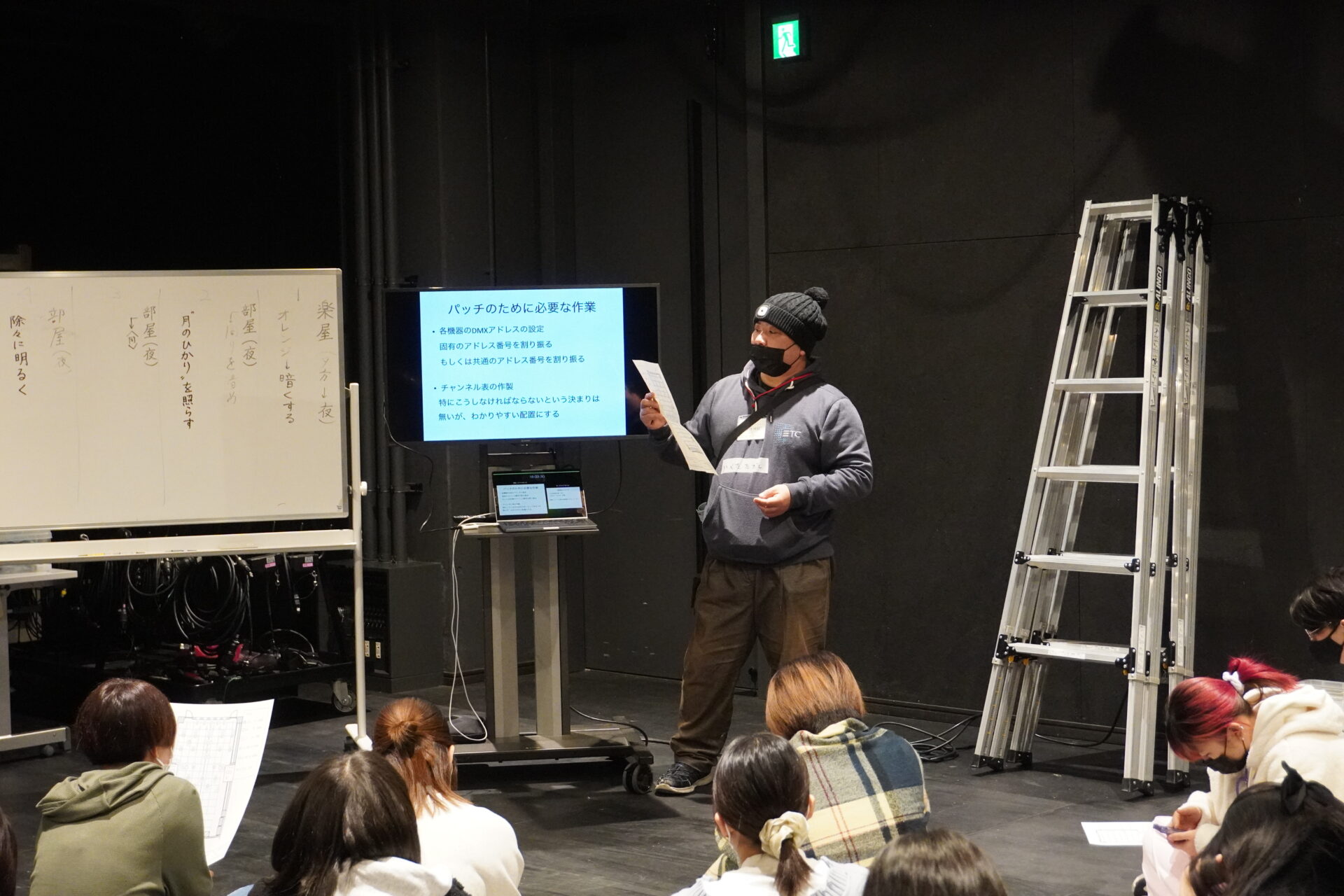 大道具制作室では舞台監督の実習が行われていました。ゲストスピーカーの大鹿さんは舞台監督として、演劇、ダンス、インスタレーションなど、ジャンルを越えて幅広く活動を展開されていて、京都を拠点に国内はもとより海外でも多数活躍されています。