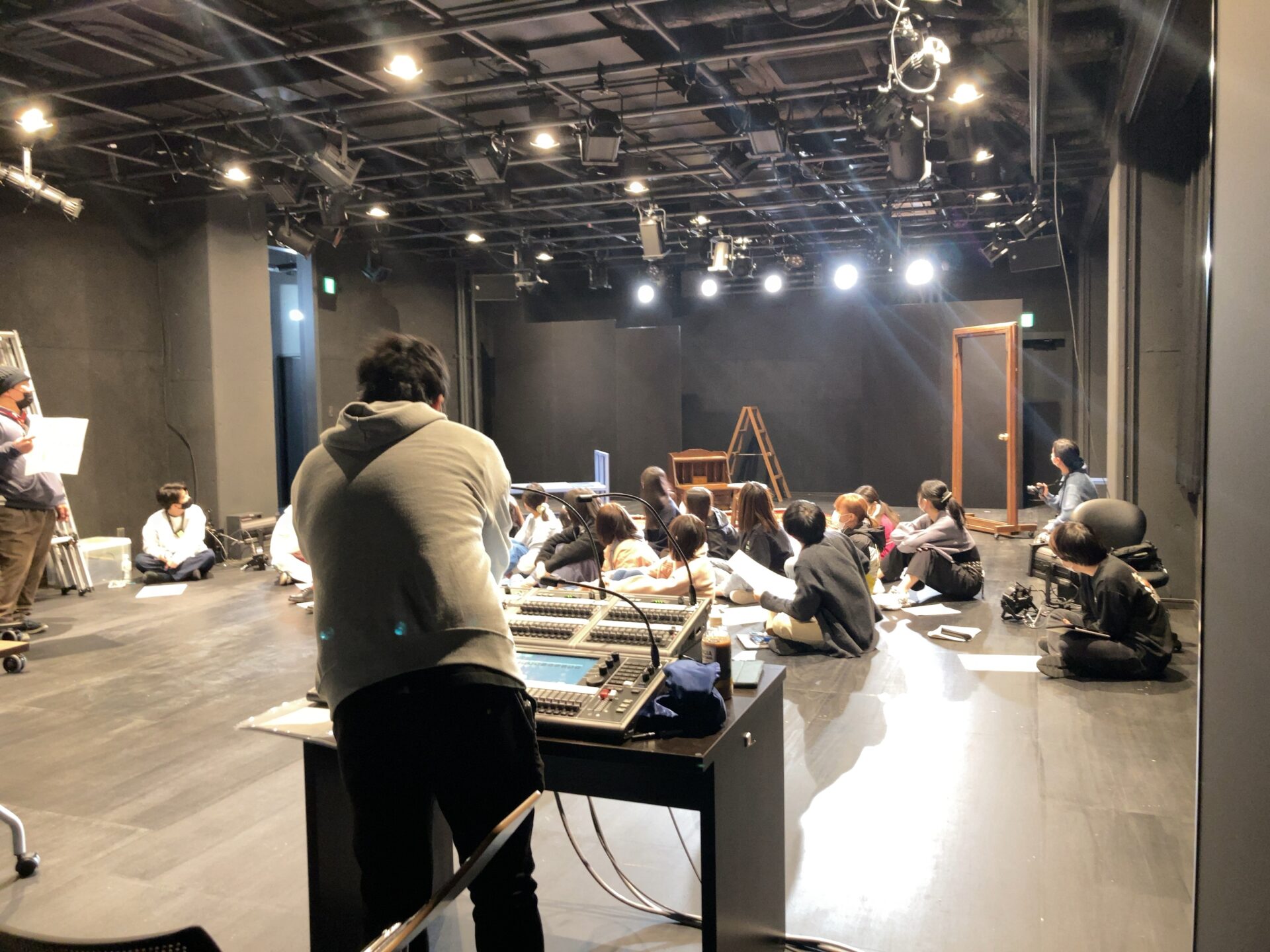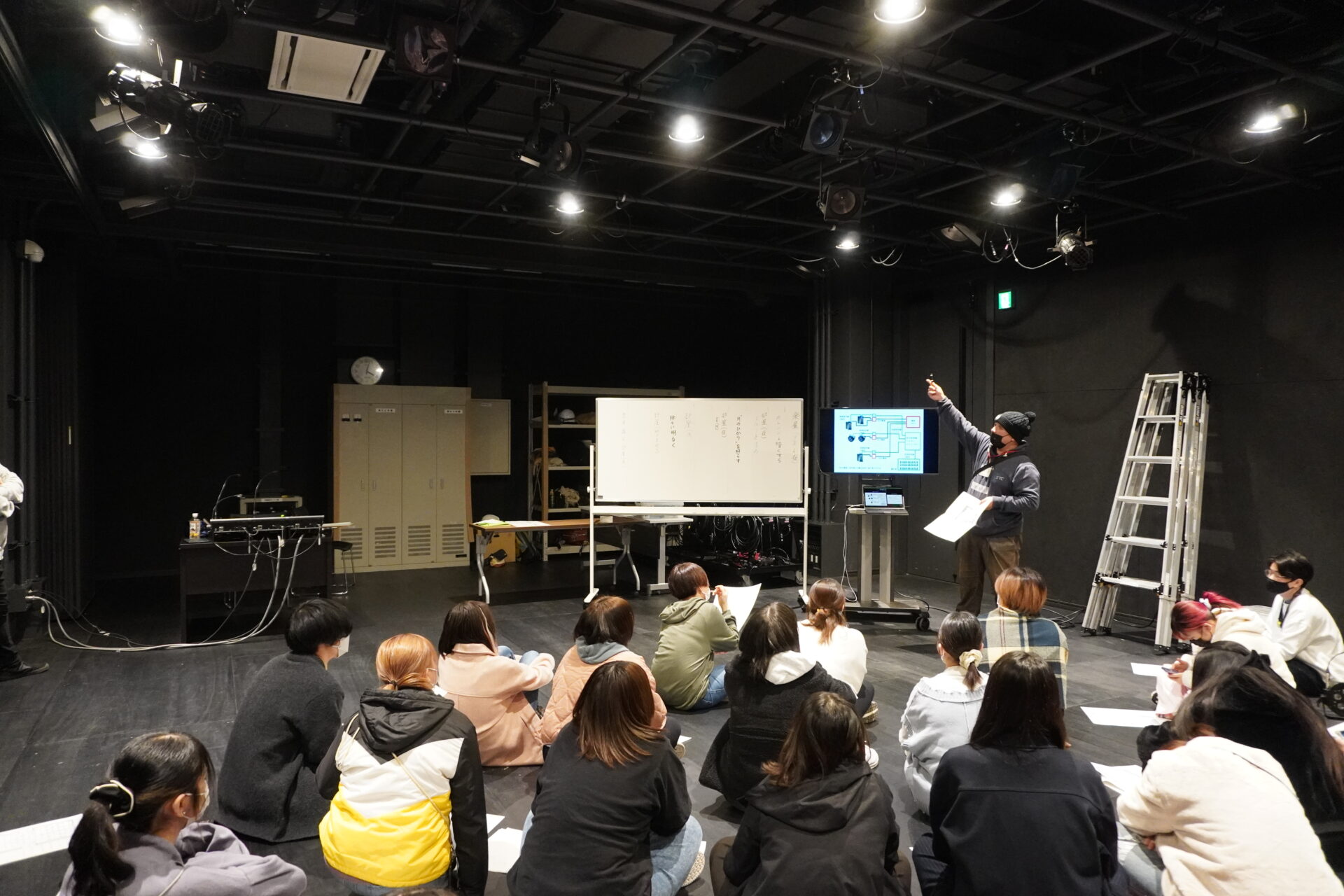 スタジオでは照明の実習が行われていました。フリー照明家の生田さんとNPO法人プラッツの藤原さんにゲストスピーカーとして来ていただいています。生田さんは2012年から2021年まで鳥の劇場にて技術監督や照明を担当されておりとても経験豊富な方です。