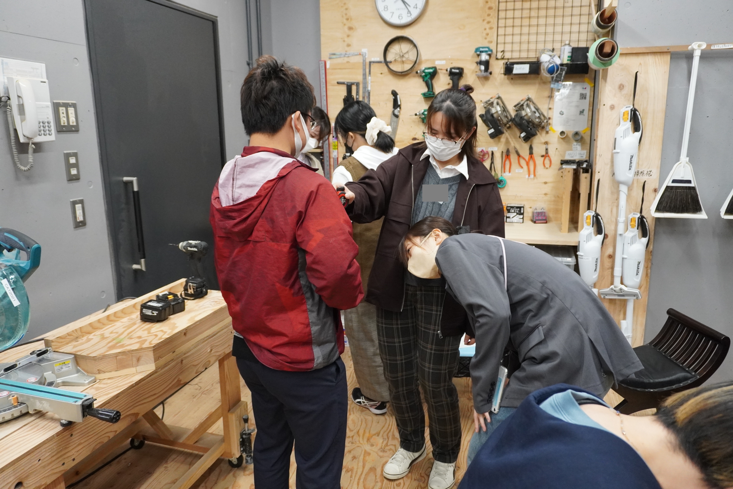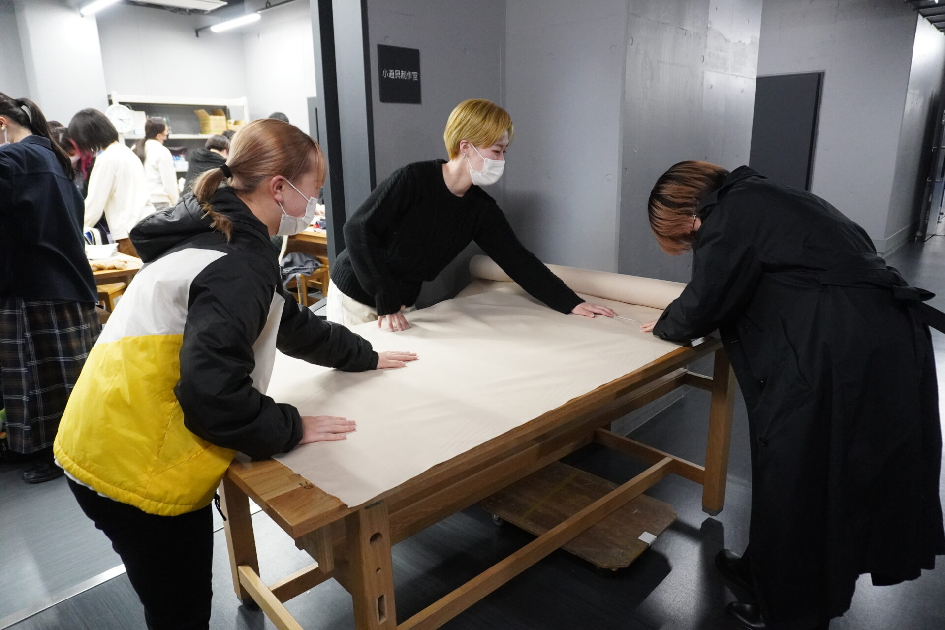 学校にある素材のなかから、チームで試行錯誤しながら作業をしていました。中原さんからは「デザインを考える段階で、役者自身と役者が演じる役のイメージの両方に合ったものになるよう意識して」とのアドバイスがありました。