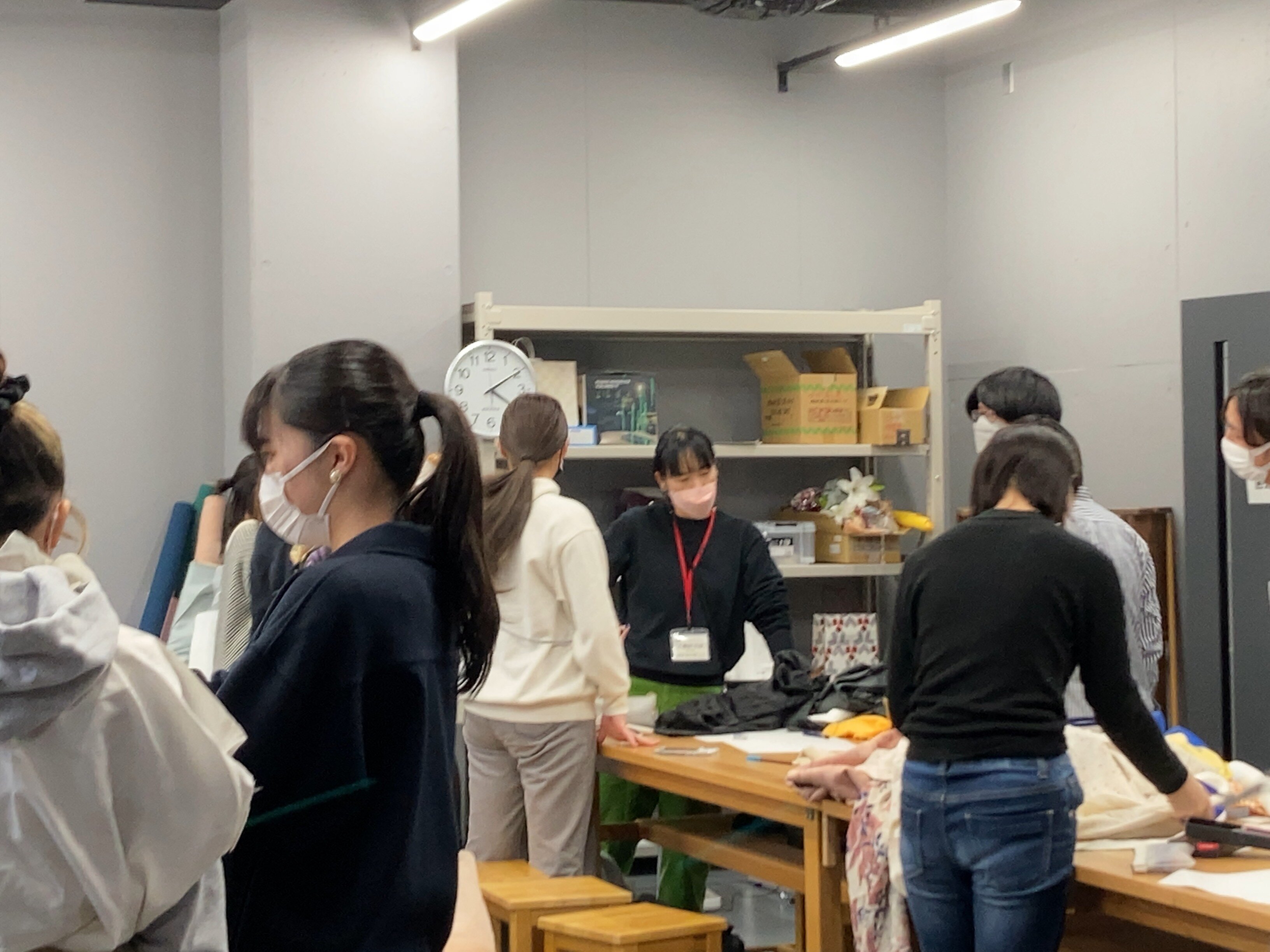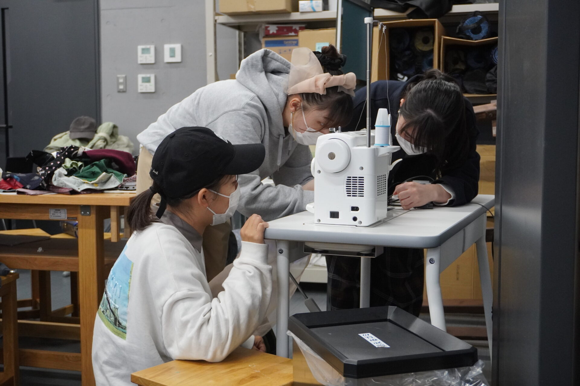 ミシンで布を縫い合わせているチームや、ボンドで布をつなぎ合わせているチーム、針金で耳の形を作成したあとに布をかぶせて動物の耳を表現しているチームもいました。授業に参加していた学生は「衣裳を作成するのは初めての経験なので、学ぶことが多くとても楽しいです」と話してくれました。