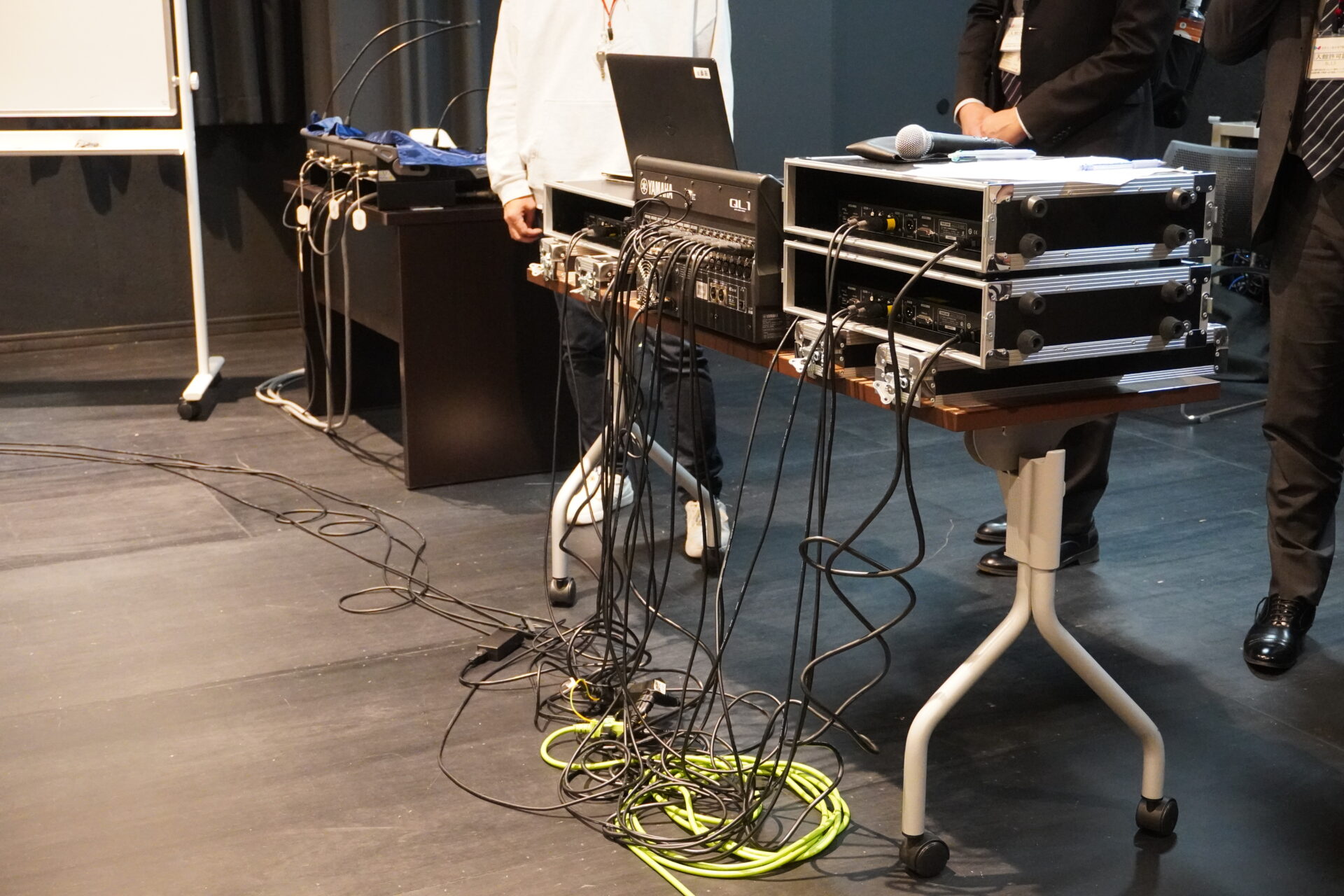 スタジオでは音響の実習が行われていました。NPO法人プラッツから野村さんにゲストスピーカーとして来ていただいています。