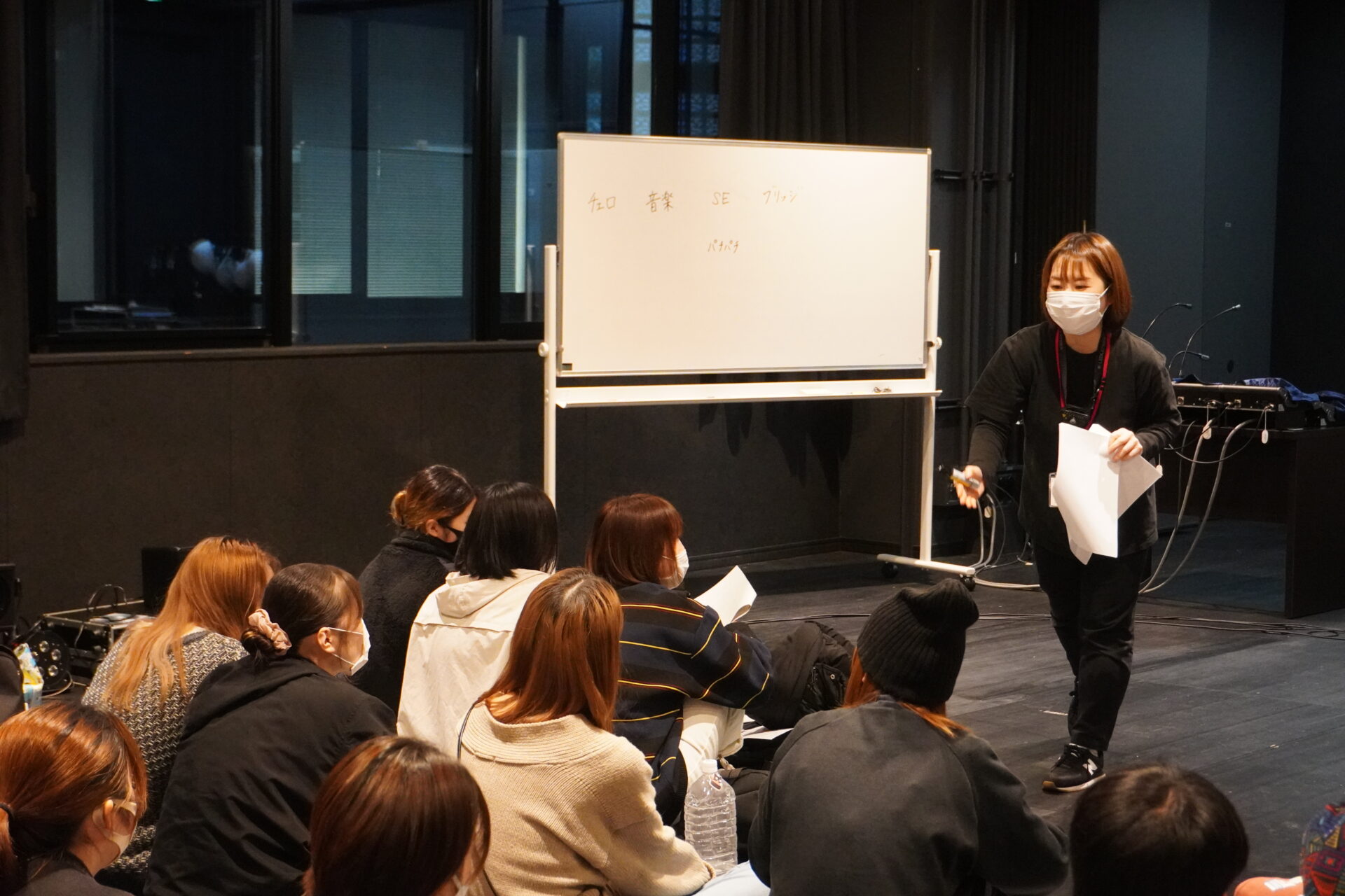 まずは実際のキャストが台本の読み合わせを行いました。その次に、どの場面でどのような音を入れるといいか学生に意見を聞いてまとめました。物が割れる音、チェロを演奏する音、ドアを叩く音、ドアが閉まる音、鍵をかける音など様々な意見がでました。
