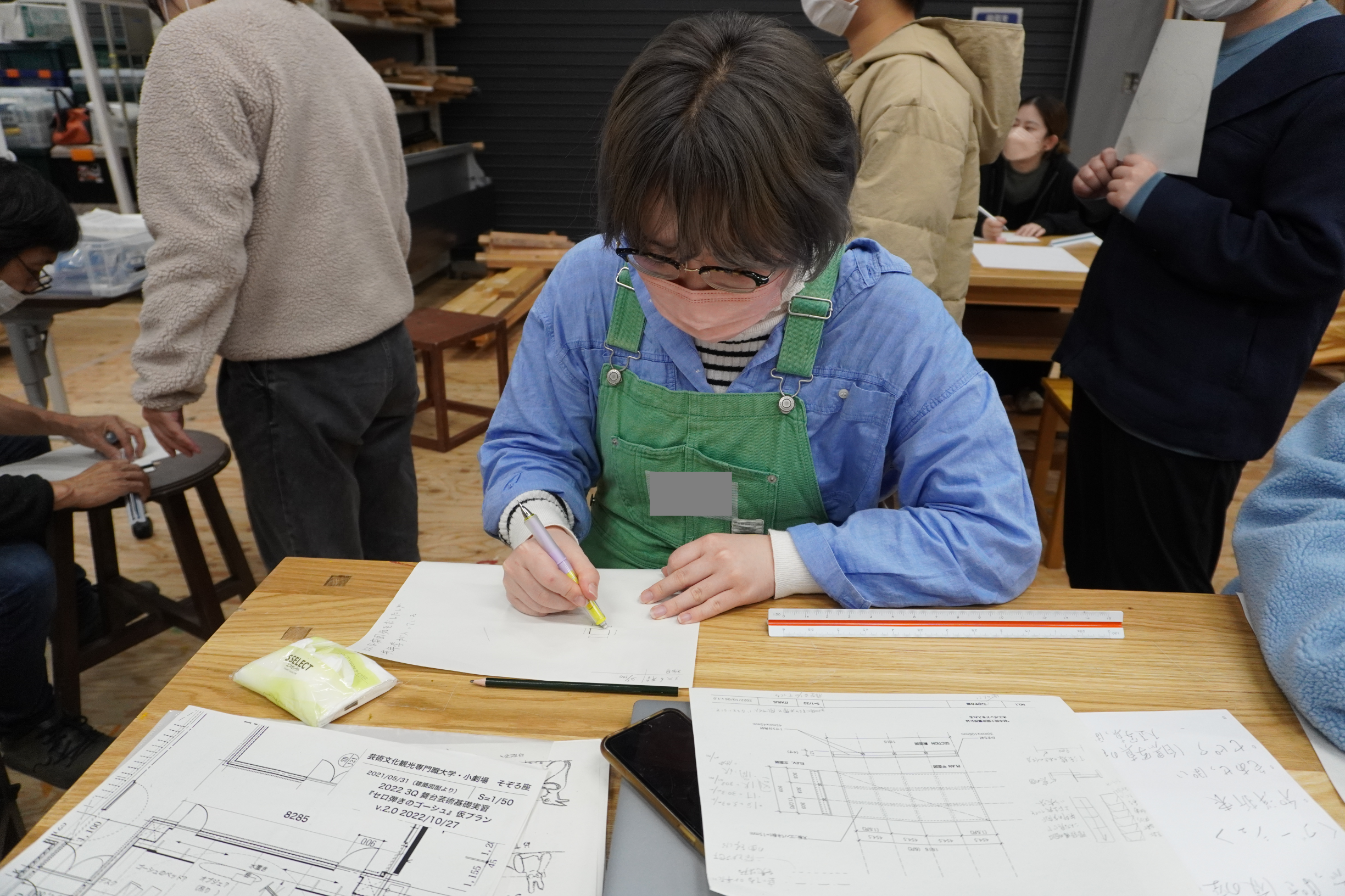 美術は本学実務家教員が担当しています。この日の実習では、図面作成の練習をしていました。舞台で使用する平台(ステージのようなもの)に寝ている自分の平面図を作成します。平面図が書けたら学生から教員に図面をチェックしてもらい、アドバイスをもらいました。