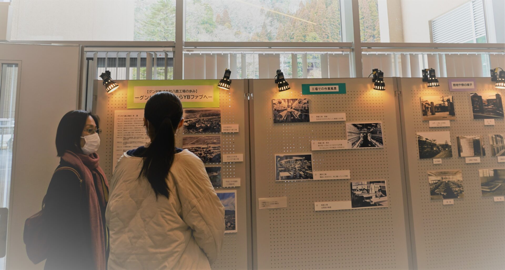 実習では、その浮世絵を借りるため京都府綾部市のグンゼ株式会社まで行き、検品を見学させていただきました。また、同時開催している『グンゼ八鹿工場からYBファブへ』のパネル展示では、学生に多くの作業を任せていただきました。