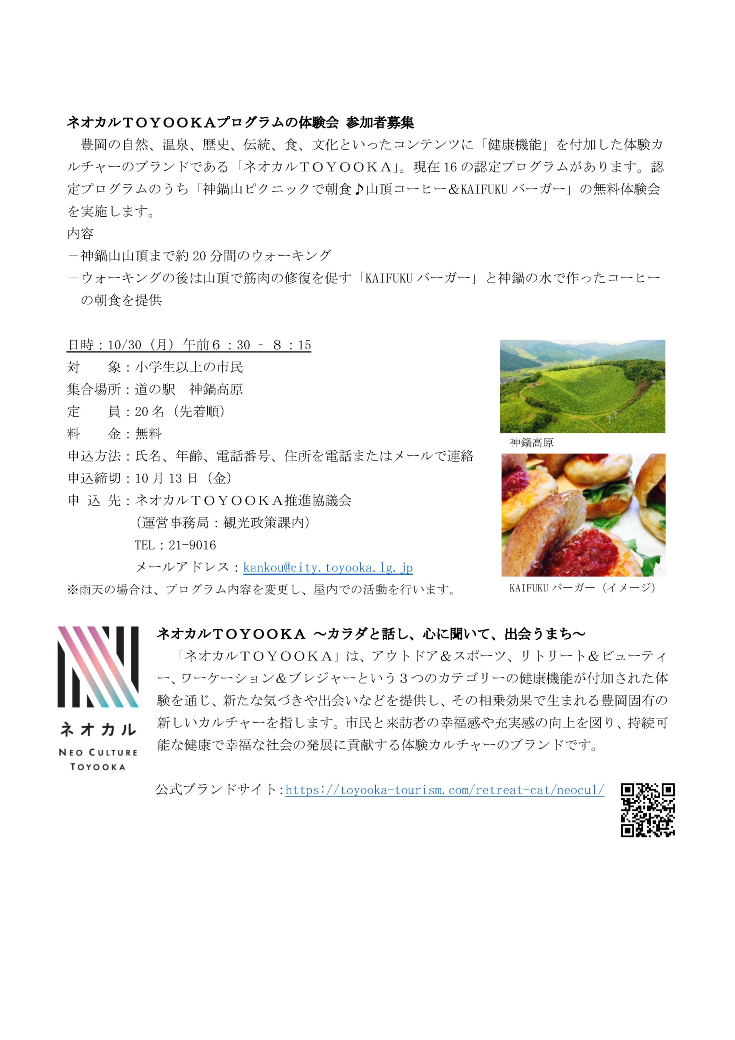 | 内容 | 神鍋山山頂まで約20分間のウォーキング ウォーキング後は山頂で筋肉の修復を促す「KAIFUKUバーガー」と神鍋の水で作ったコーヒーの朝食を提供 |