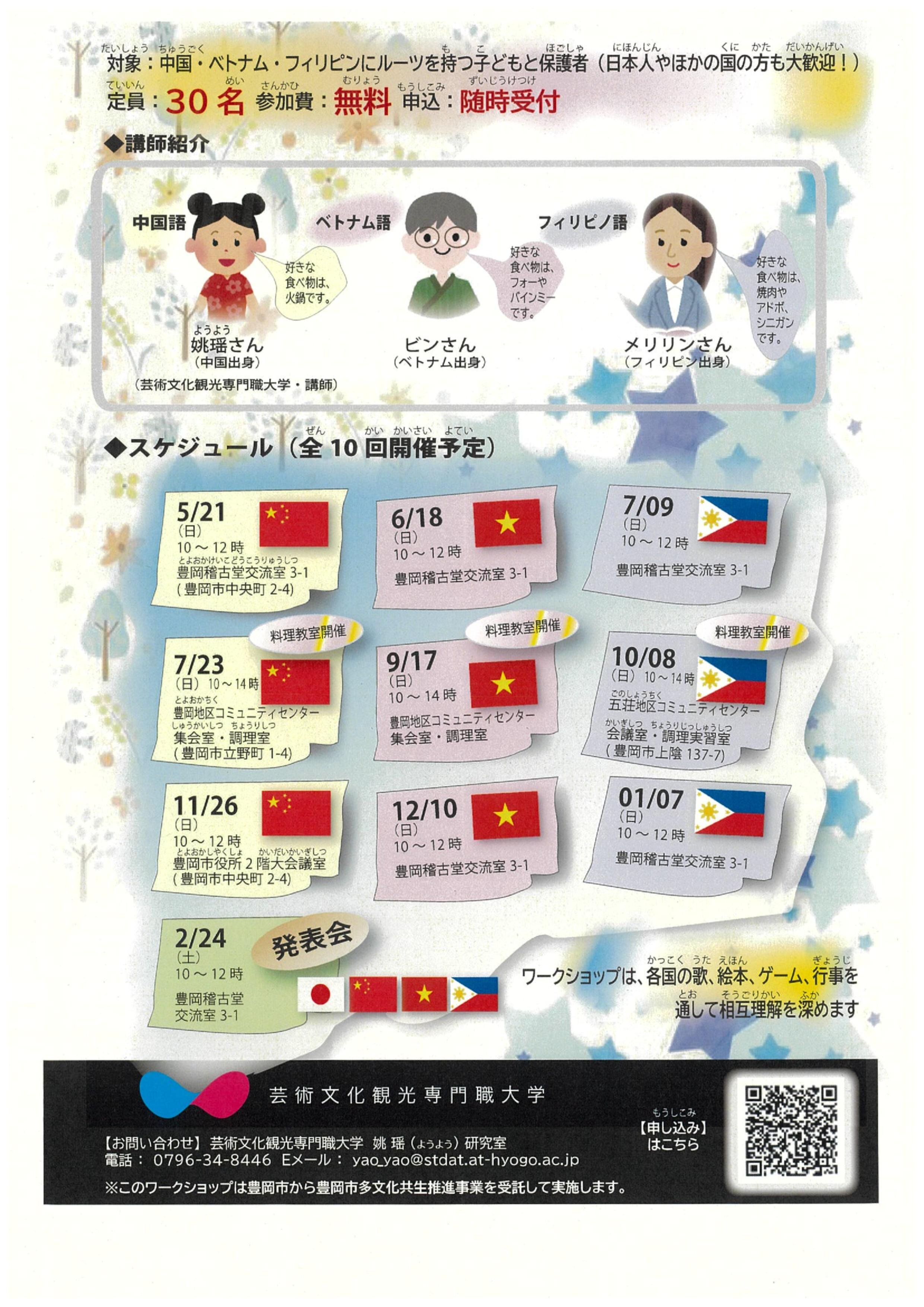 今年度、本学では豊岡市からの委託を受けて、中国・ベトナム・フィリピンにルーツを持つ親子を対象にワークショップを開催し各国の歌、絵本、ゲーム、行事を通して相互理解を深めています。今回はフィリピン料理教室を10月8日(日)10時から豊岡市上陰の五荘地区コミュニティセンター調理室で開催します。皆様のご参加をお待ちしております。