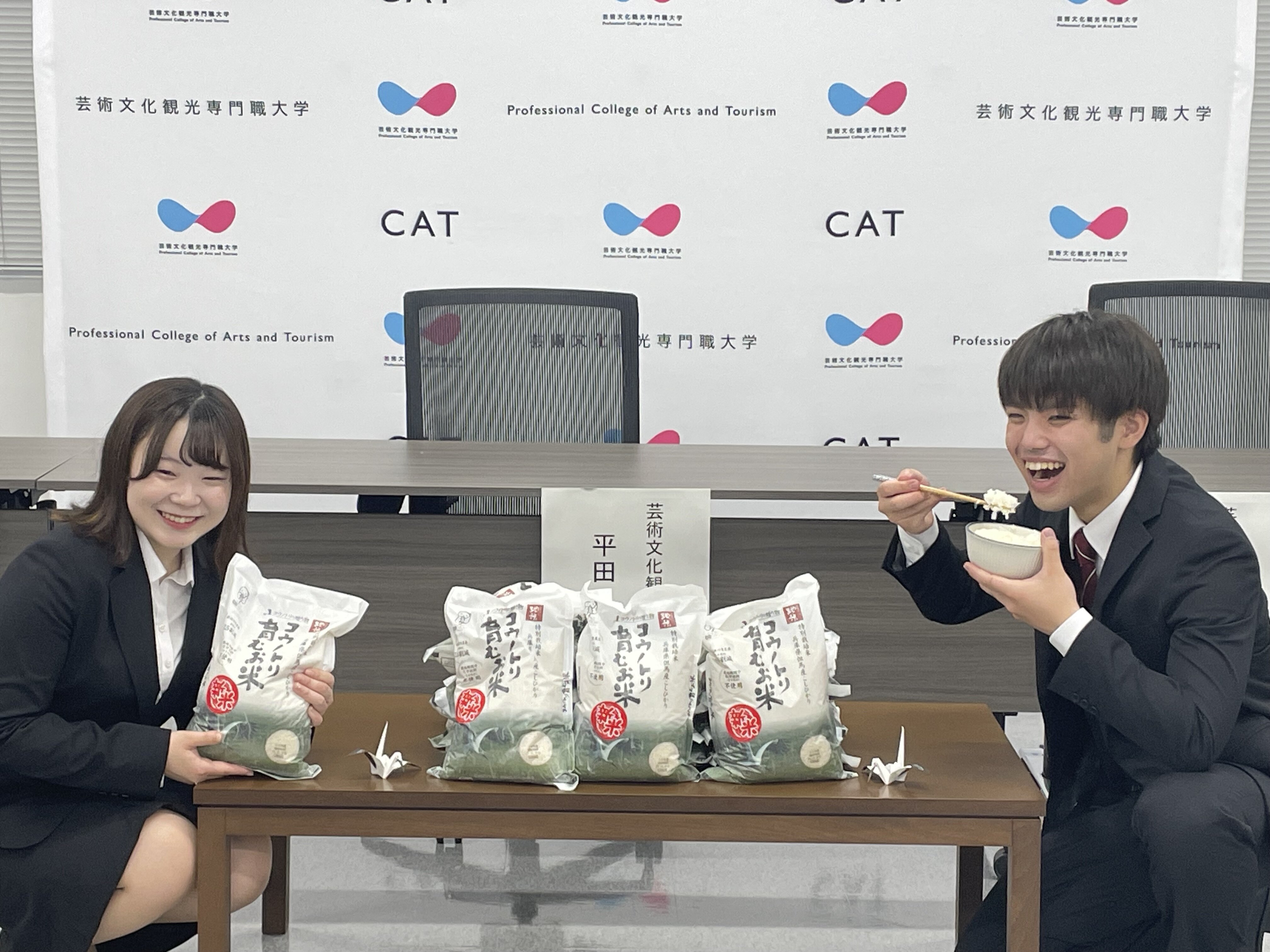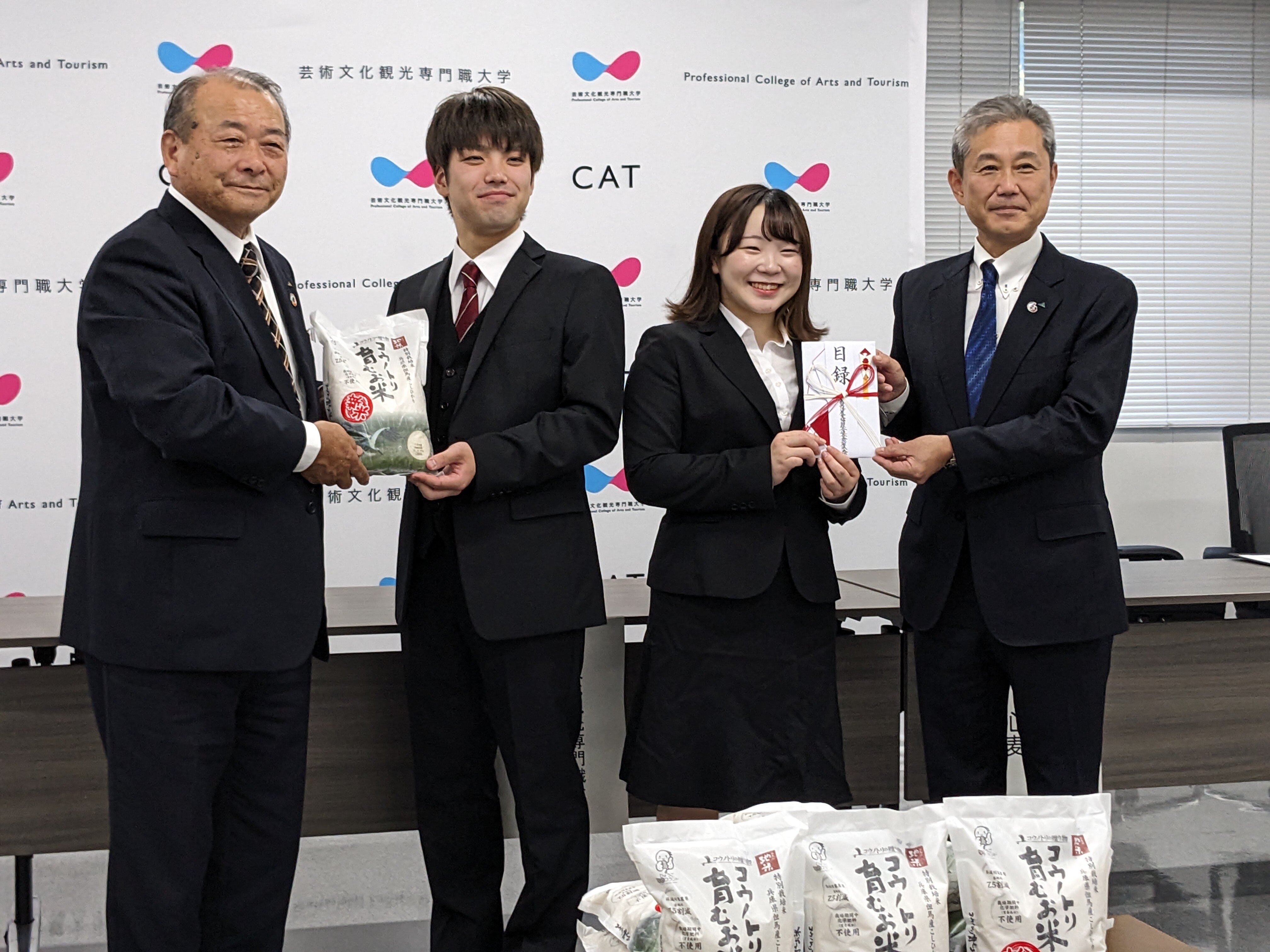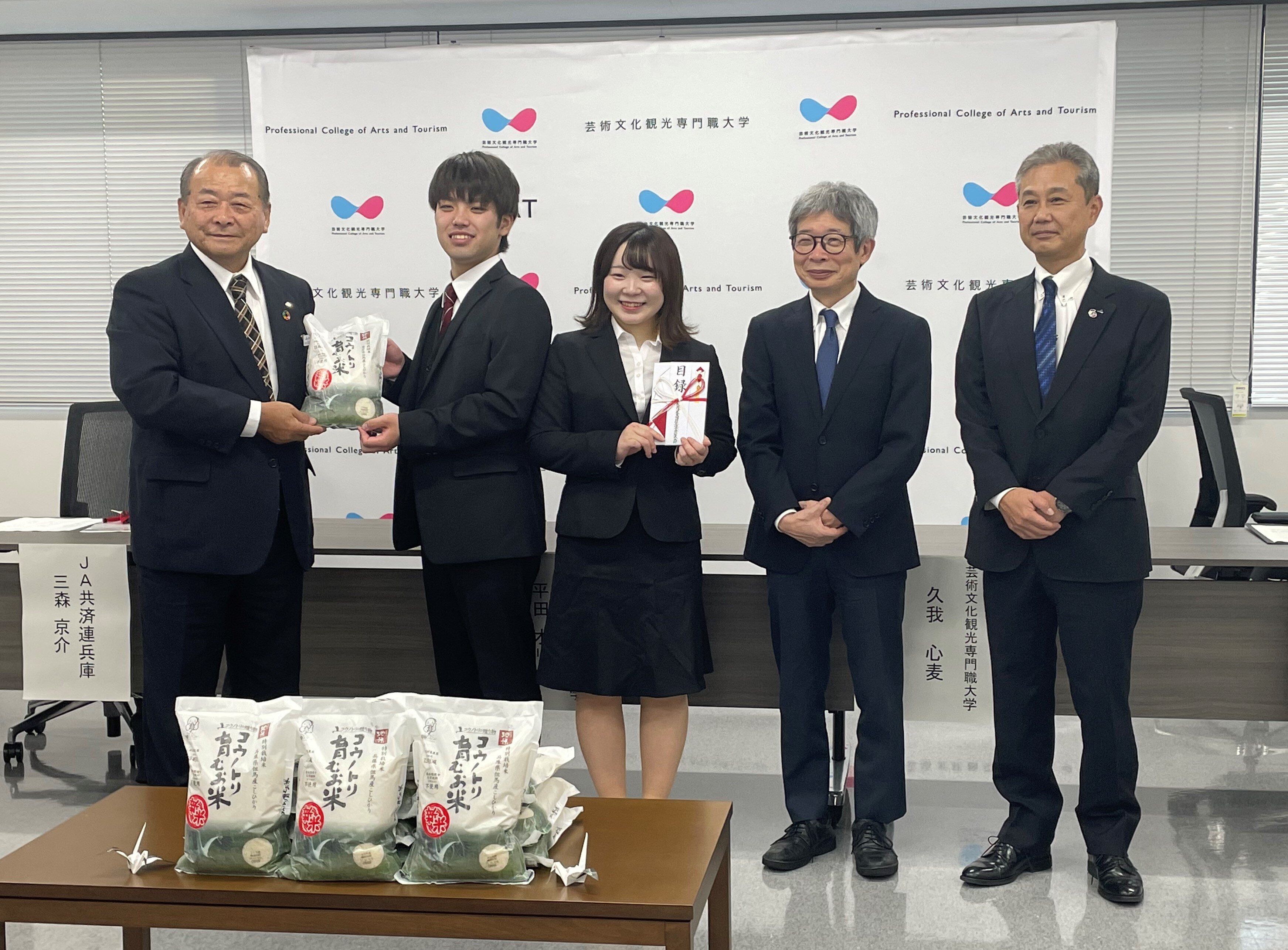 10月23日(月)、全国共済農業協同組合連合会兵庫県本部(JA共済連兵庫)から芸術文化観光専門職大学学生へのお米200kg贈呈式が本学にて執り行われました。
