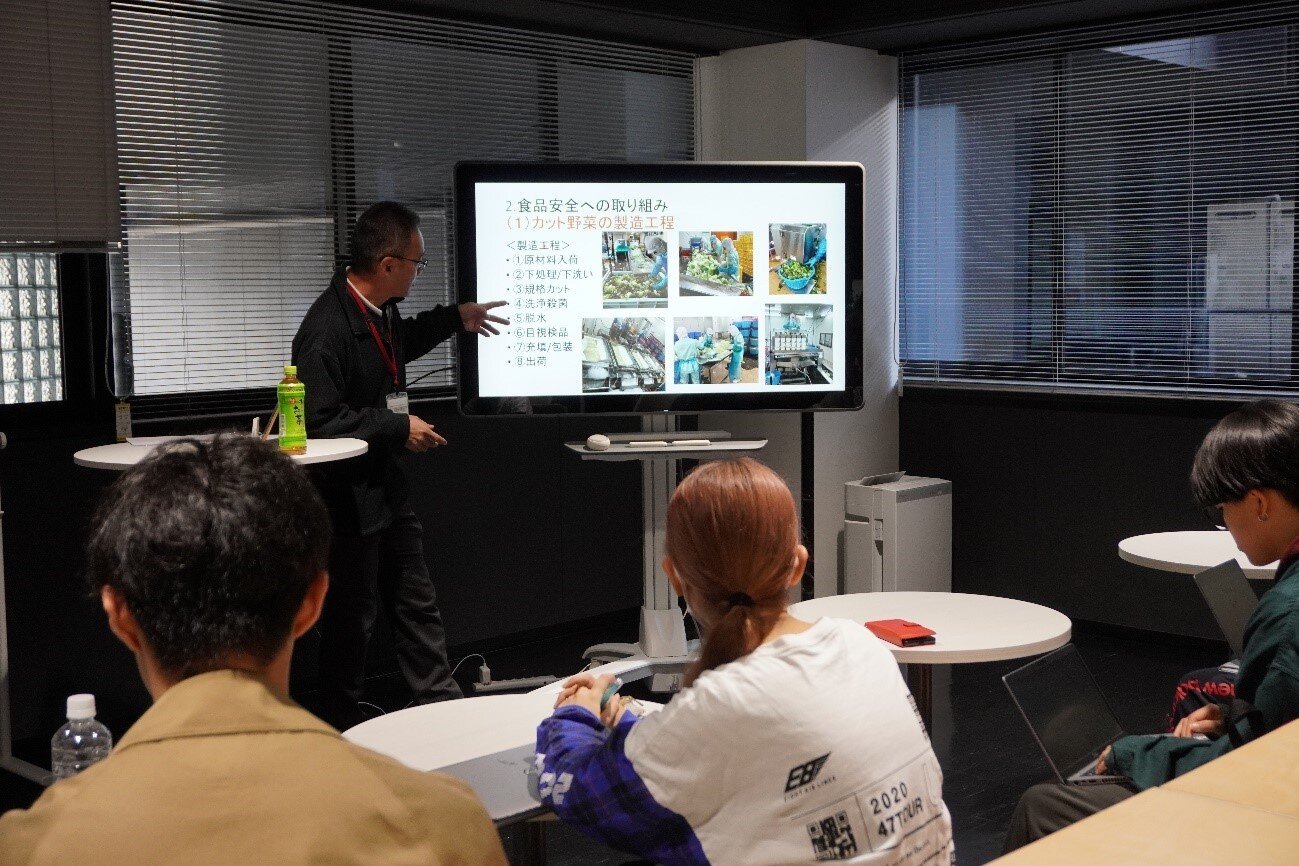授業の前半では、原材料を入荷してからカット野菜になるまでの製造工程について説明がありました。野菜の洗浄に使う水について等、時折学生からの疑問にもお答えいただきながら詳しく教えていただきました。
