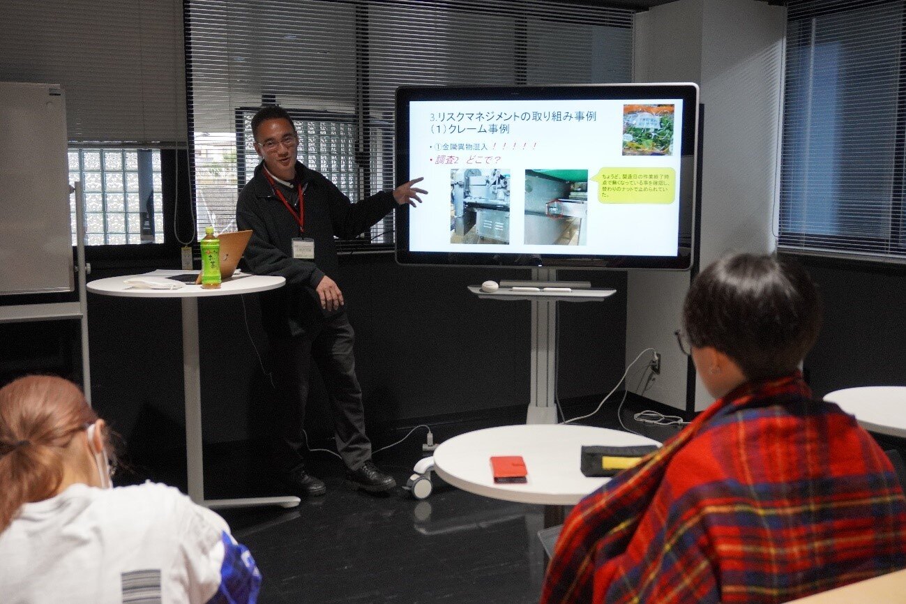 この日の授業では、株式会社誠孝から品質管理室の酒勺重人さまにお越しいただき、「食品のリスクマネジメントへの取り組み」というテーマでカット野菜の食品安全について講義していただきました。